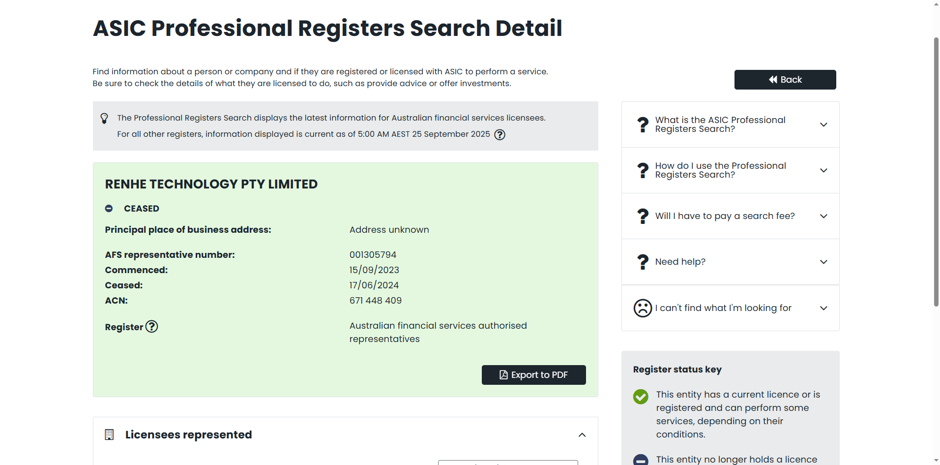 Upon investigation, we found that Ren He Technology Pty Limited has had its AR license it previously claimed to possess cancelled. This suggests that the company may have ceased operating.