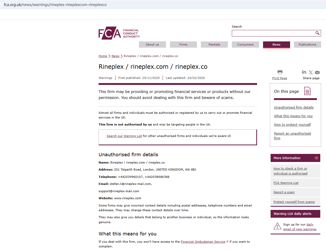 On Feb 24, 2026,, the Financial Conduct Authority (FCA) issued a warning regarding Rineplex, suspecting that this company may be offering financial services or products without the necessary authorization. https://www.fca.org.uk/news/warnings/rineplex-rineplexcom-rineplexco