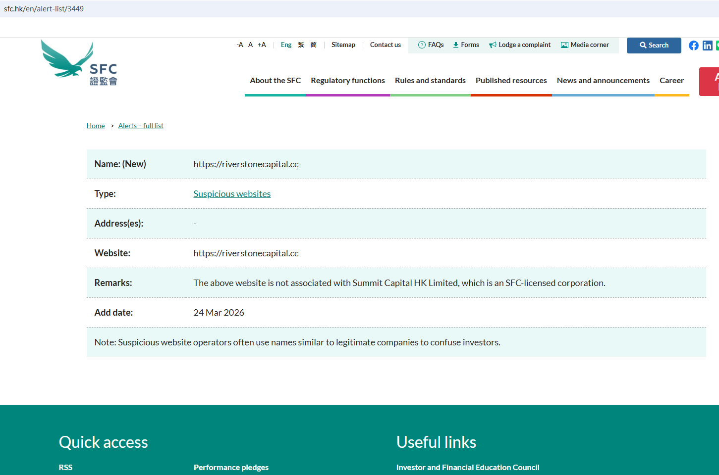 On Mar 24, 2026, the Securities And Futures Commission(SFC) issued a warning against Riverstone Capital, believing this company might be providing financial services or products without proper authorization in the HK. https://www.sfc.hk/en/alert-list/3449