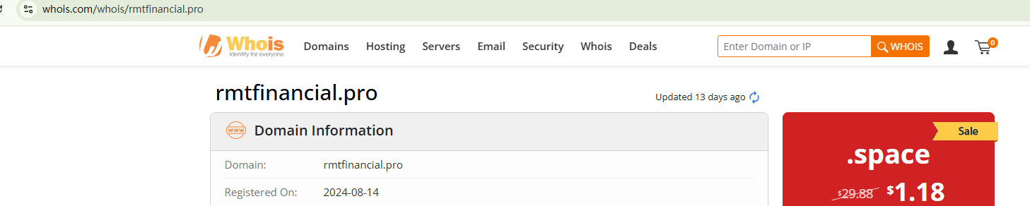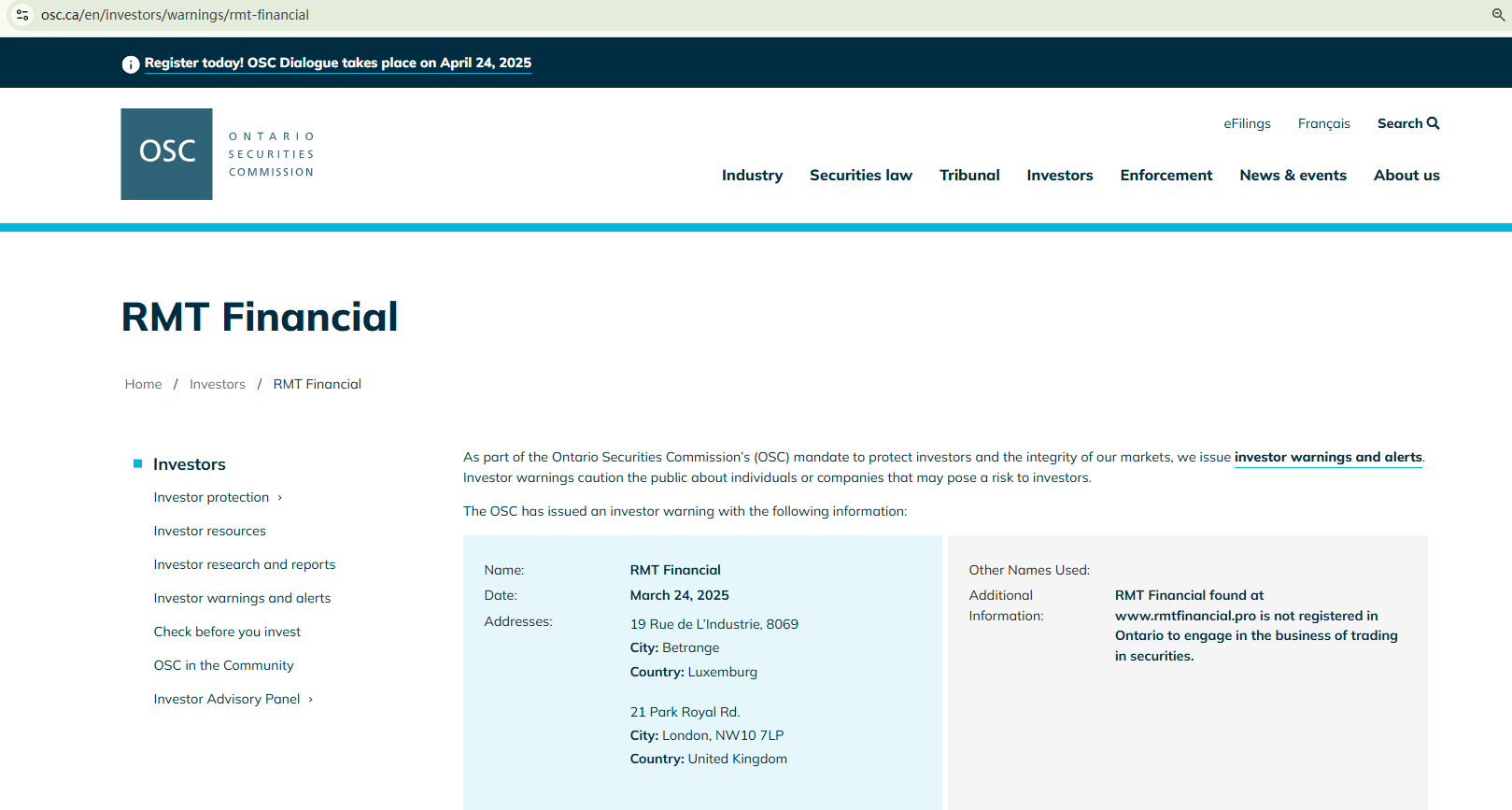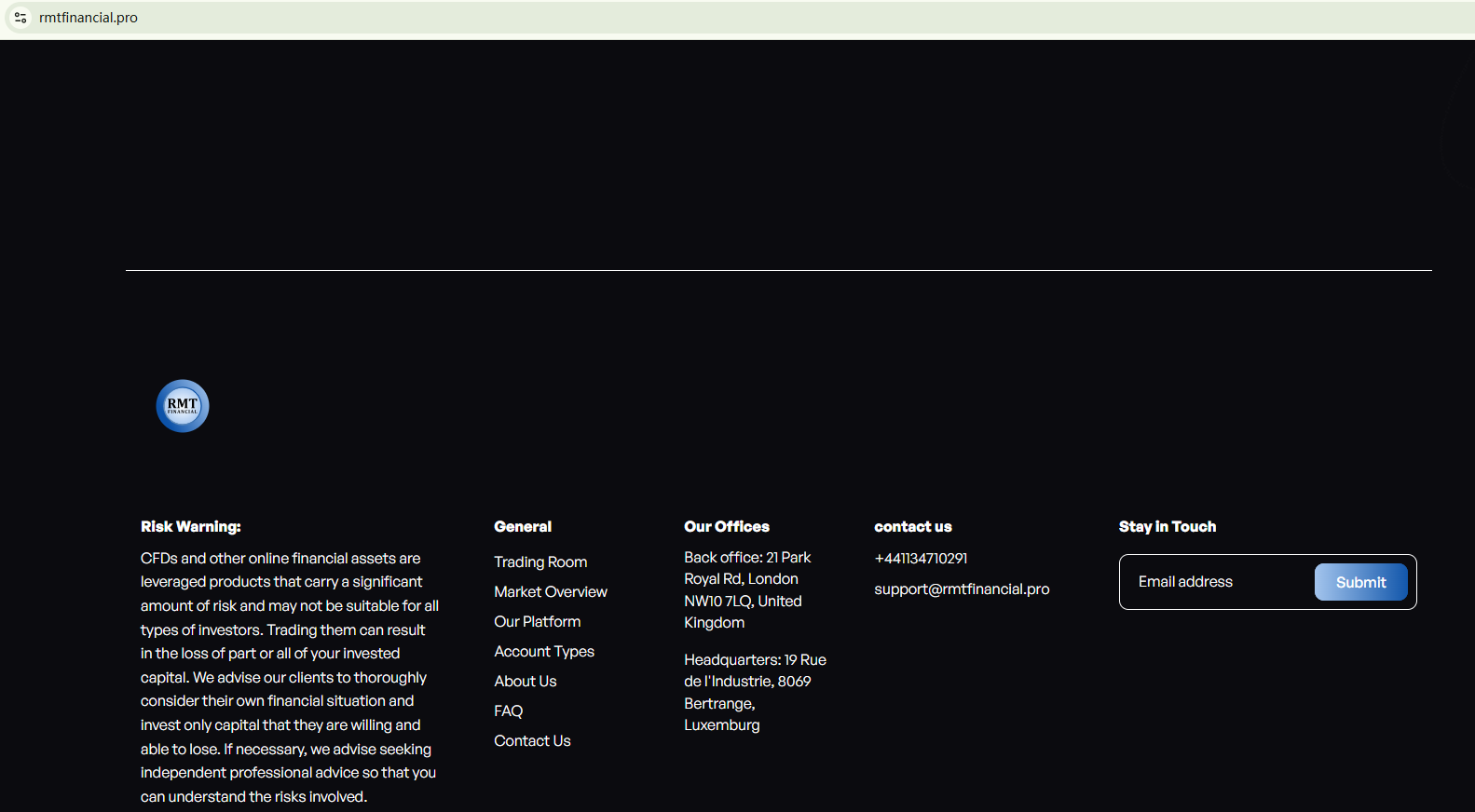 RMT Financial seems to have emerged recently, with its domain name registered in August 2025. The website fails to provide valid information about their identity and regulatory status, a major red flag. In addition, the Ontario Securities Commission (OSC) issued a warning against RMT Financial, stating that this broker is not registered in Ontario to engage in the business of trading in securities.