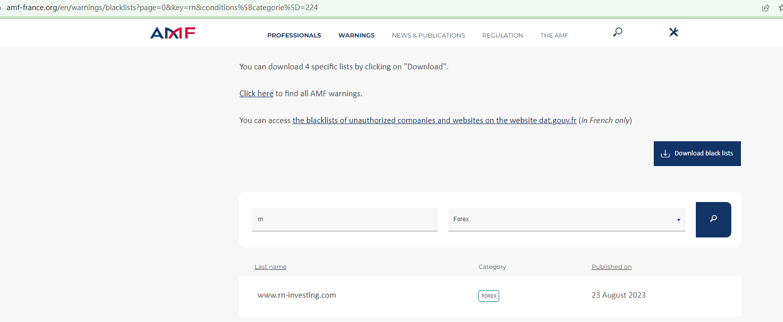 According to findings from its website, RNInvesting claims to be regulated but does not display specific regulatory information on its web page. In addition, the French Financial Agency (AMF) has put RNInvesting on the warning list.The truth is that RNInvesting is not under valid regulation by any regulators to do forex. Investors' funds in this broker are unsafe and cannot be protected by any law. Therefore, RNInvesting is a scam.