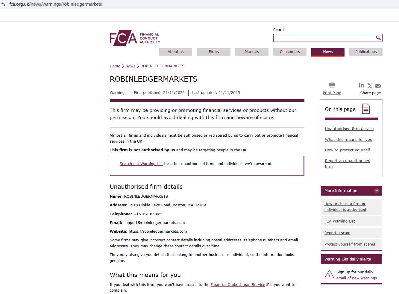 On November 21, 2025, the Financial Conduct Authority (FCA) issued a warning regarding ROBINLEDGERMARKETS, suspecting that this company may be offering financial services or products without the necessary authorization. https://www.fca.org.uk/news/warnings/robinledgermarkets