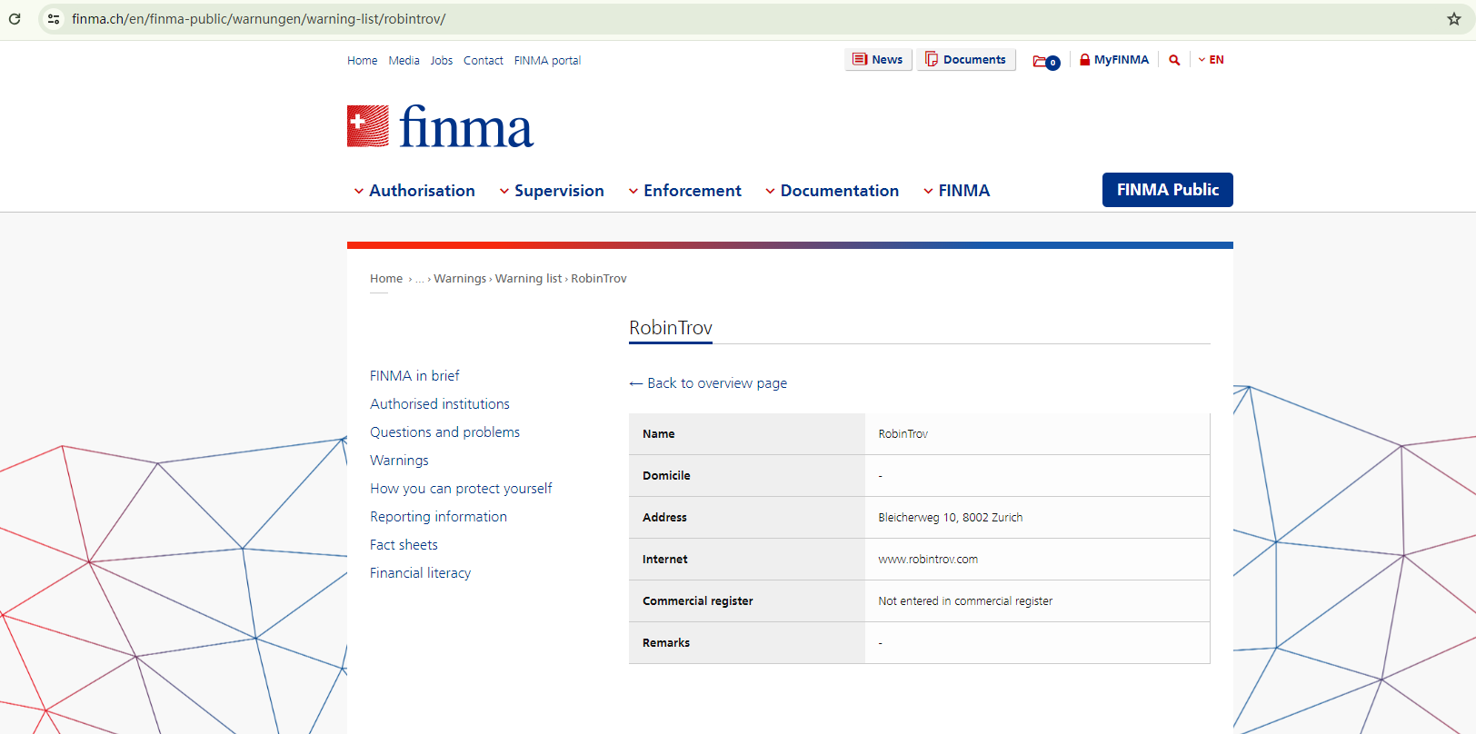 RobinTrov fails to disclose any regulatory information as the evidence of its legitimacy in the forex market. This is a red flag.Despite its claimed location in Switzerland, it hasn't complied with the pertinent regulations, as evidenced by the warning from the Swiss Financial Market Supervisory Authority (FINMA).In essence, RobinTrov is not regulated by any governing body. Entrusting it with investors' funds is highly risky, as there are no legal protections in place to safeguard the funds.RobinTrov appears to be a scam.
