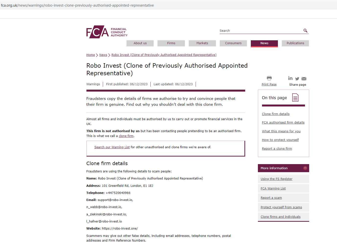 In addition, the United Kingdom Financial Conduct Authority (FCA) issued a warning the clone firm of Robo Invest. And these fraudsters are using the details of firms FCA-authorized to try to convince people that they work for a genuine, authorized firm.