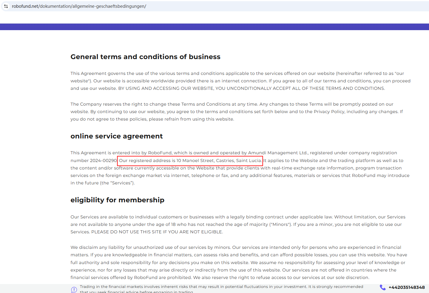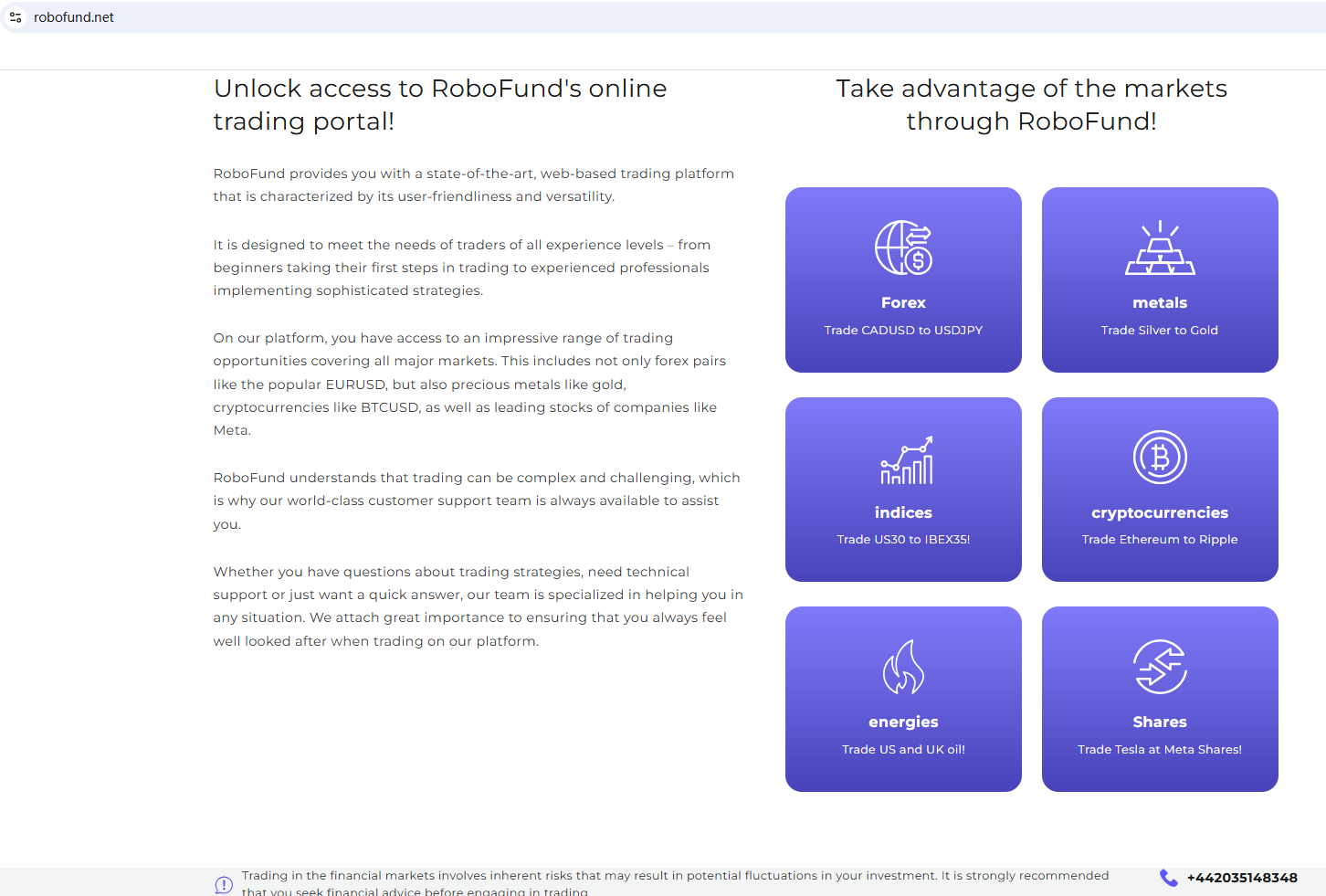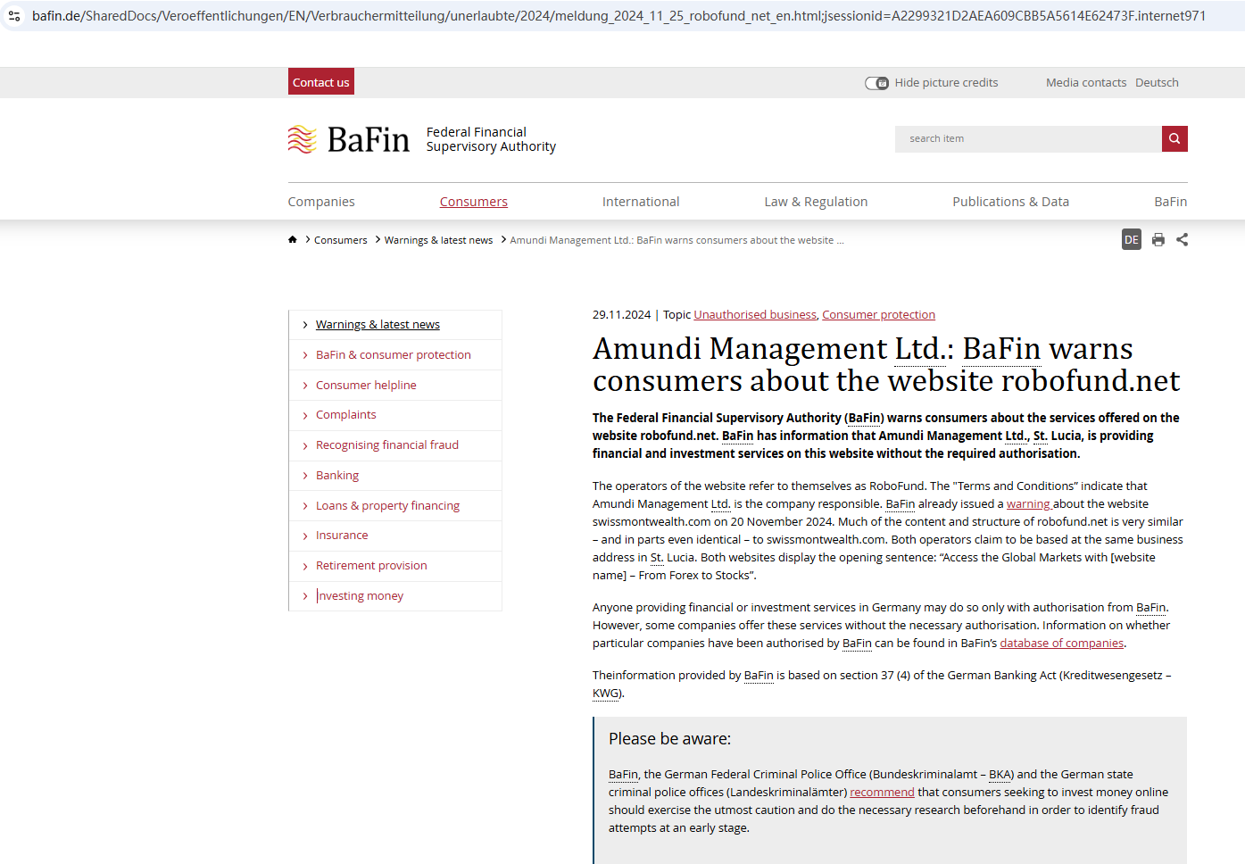 In addition, the Federal Financial Supervisory Authority (BaFin) warned consumers about the website robofund.net, stating the operator is providing financial and investment services on this website without the required authorization.