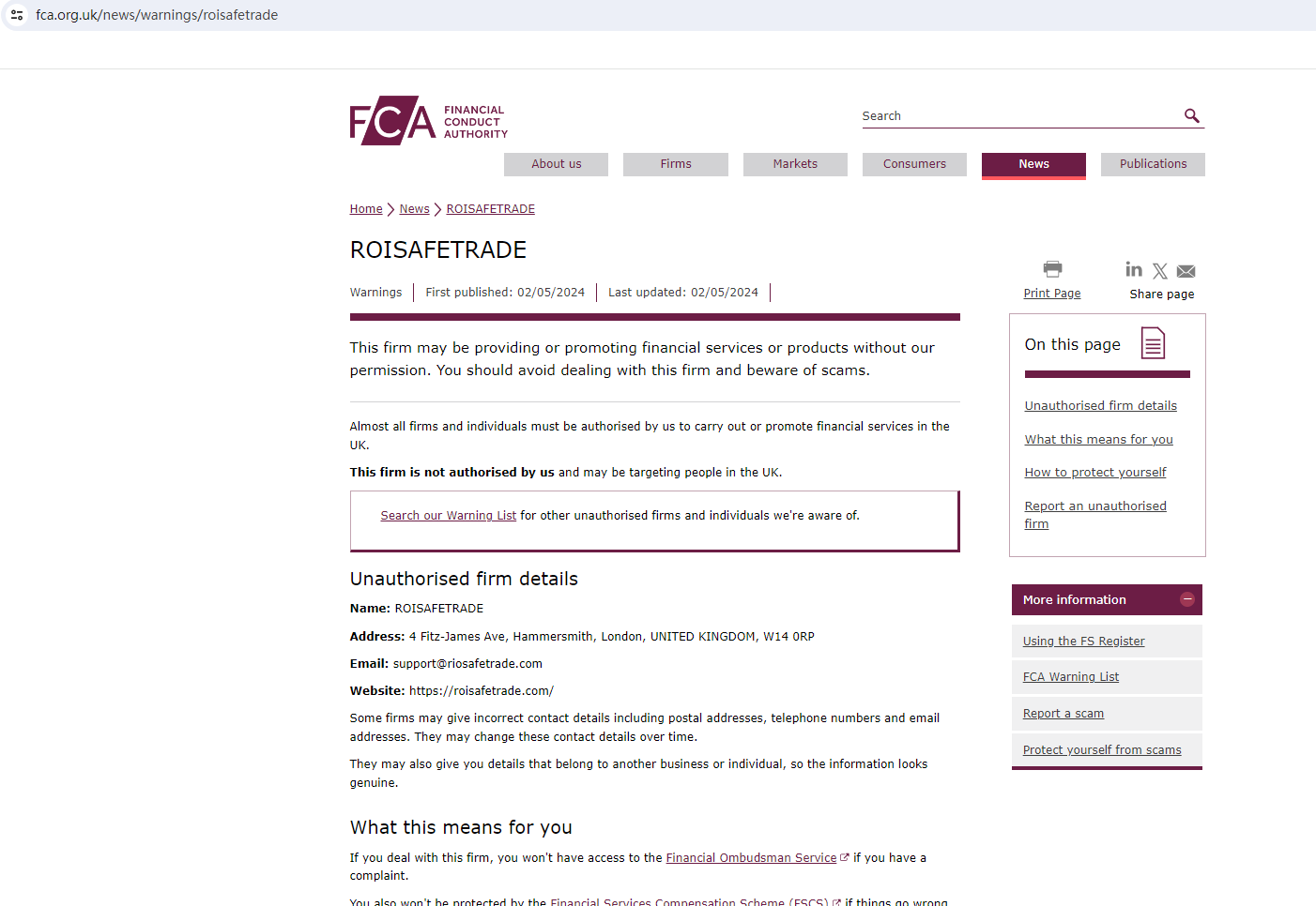 While it claims to be domiciled in the UK, the Financial Conduct Authority (FCA) has issued a warning about ROISAFETRADE, flagging it as an unauthorized firm and advising investors to stay away from it.