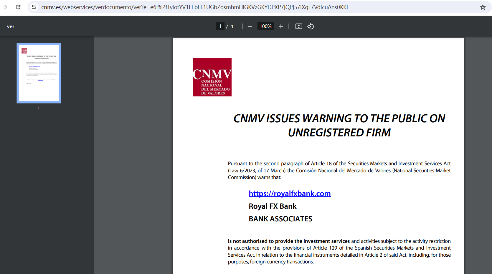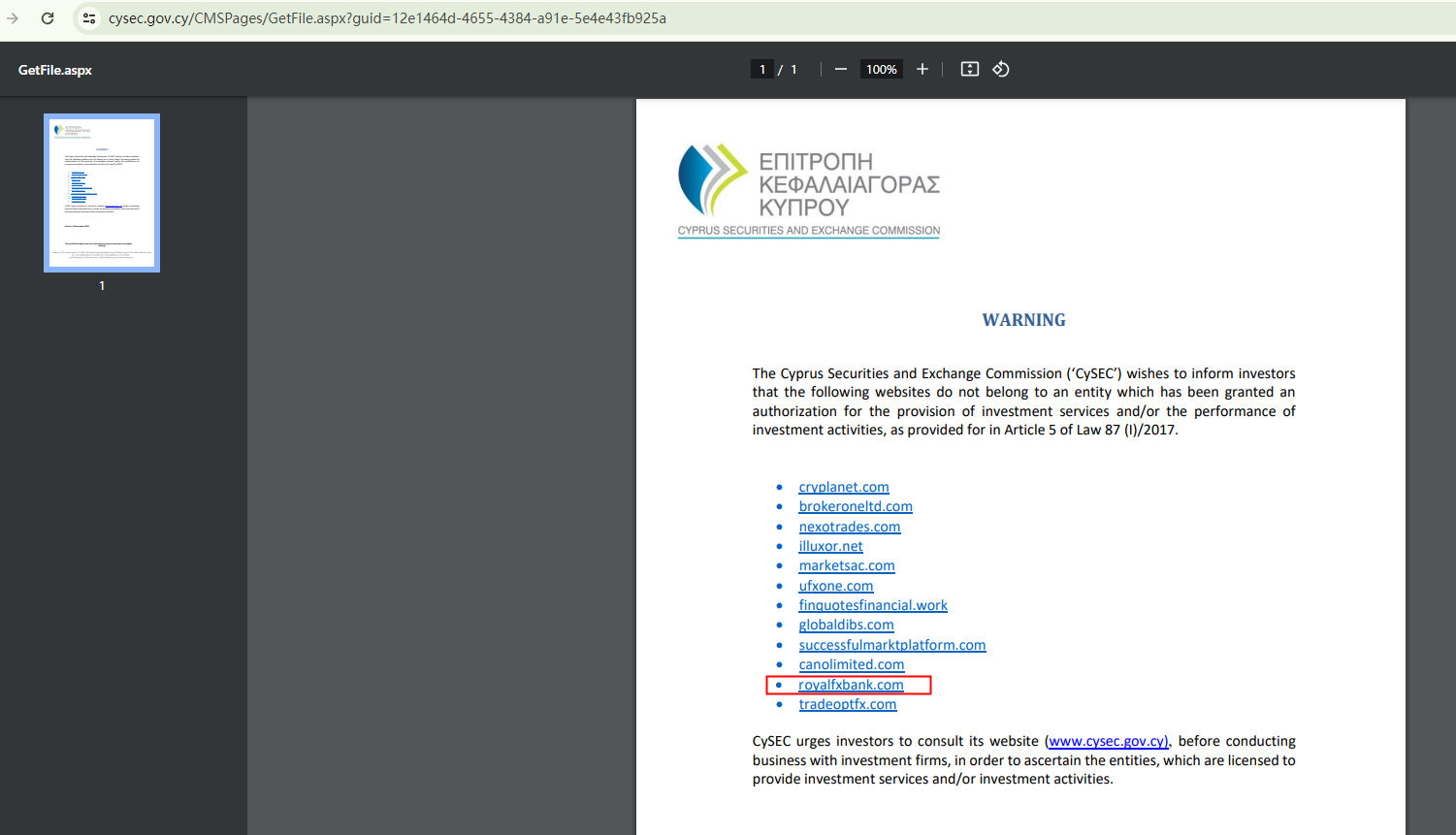 In addition, the Cyprus Securities and Exchange Commission (CySEC) has flagged royalfxbank.com as an unlicensed investment website.