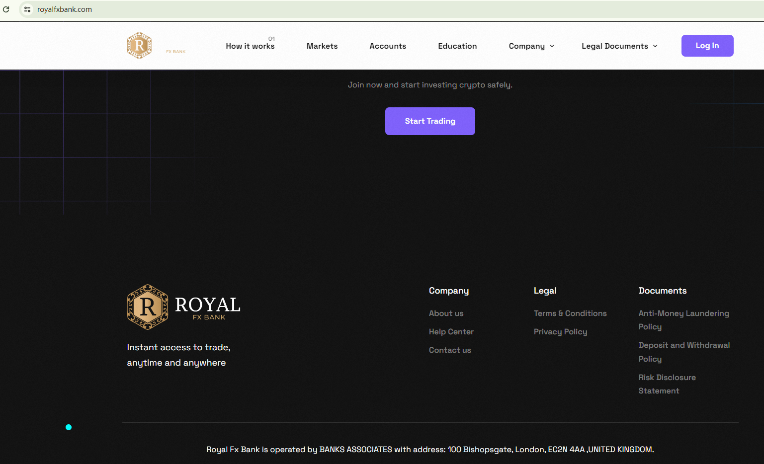 Royal Fx Bank claims to be operated by BANKS ASSOCIATES with an address in the UK. However, in the Companies House (CH), Banks Associates Limited is dissolved. What's more, the Financial Conduct Authority (FCA) doesn't have information associated this website and the company. Royal Fx Bank turns out to be an unlicensed trading platform.
