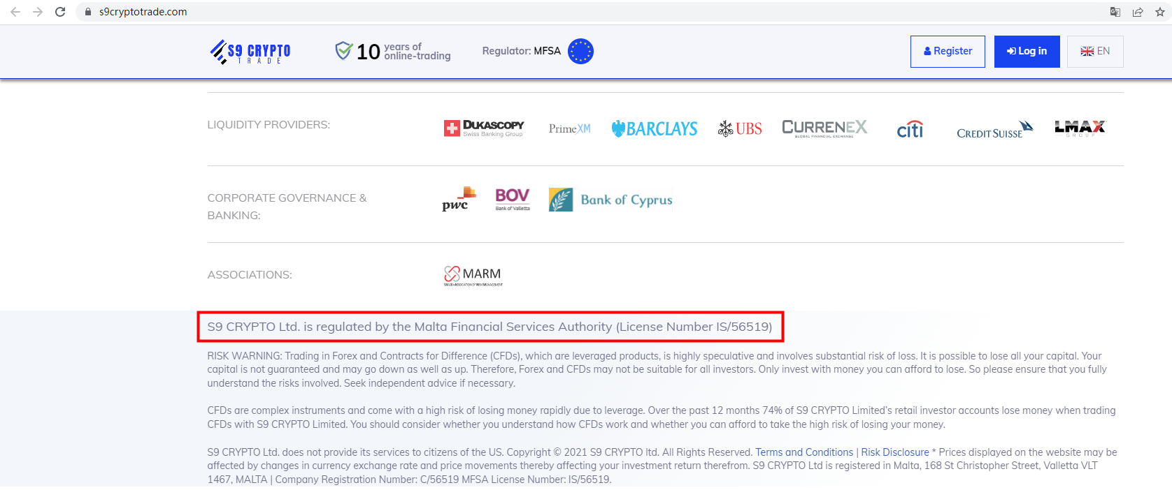 S9 Crypto Ltd claims to be regulated by the Malta Financial Services Authority (MFSA). We searched the MFSA and found it appears to be a clone of the website of the legitimate entity. It is a red flag.