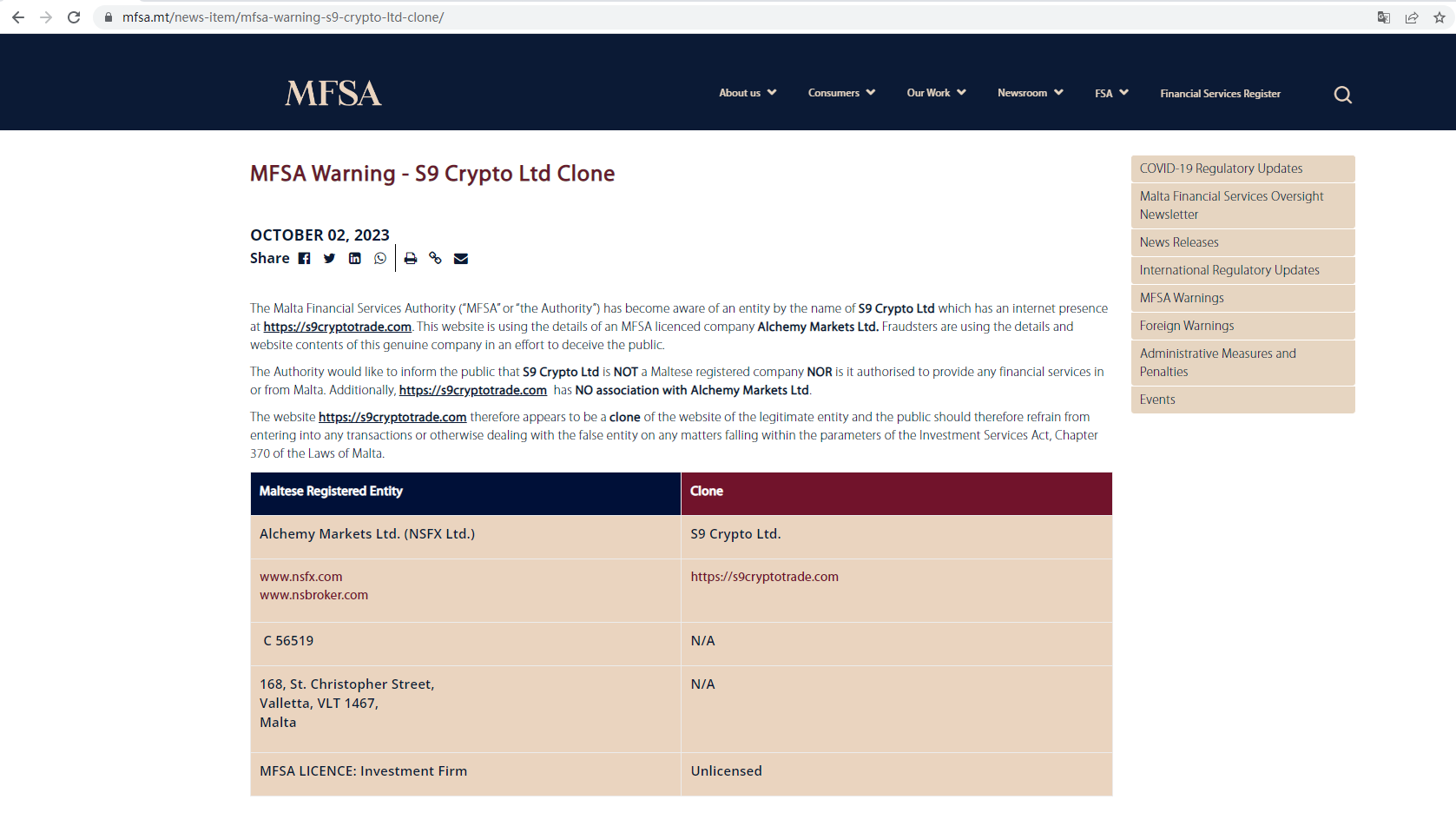 The Malta Financial Services Authority (MFSA) issued a warning that S9 Crypto Ltd was a clone of the website of the legitimate entity.