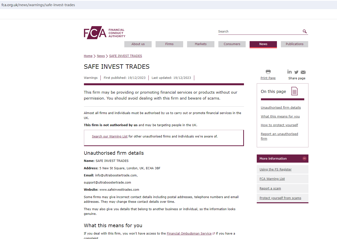 In addition, the United Kingdom Financial Conduct Authority (UK FCA) issued a warning that SAFE INVEST TRADES was providing financial services or products in the UK without authorisation.