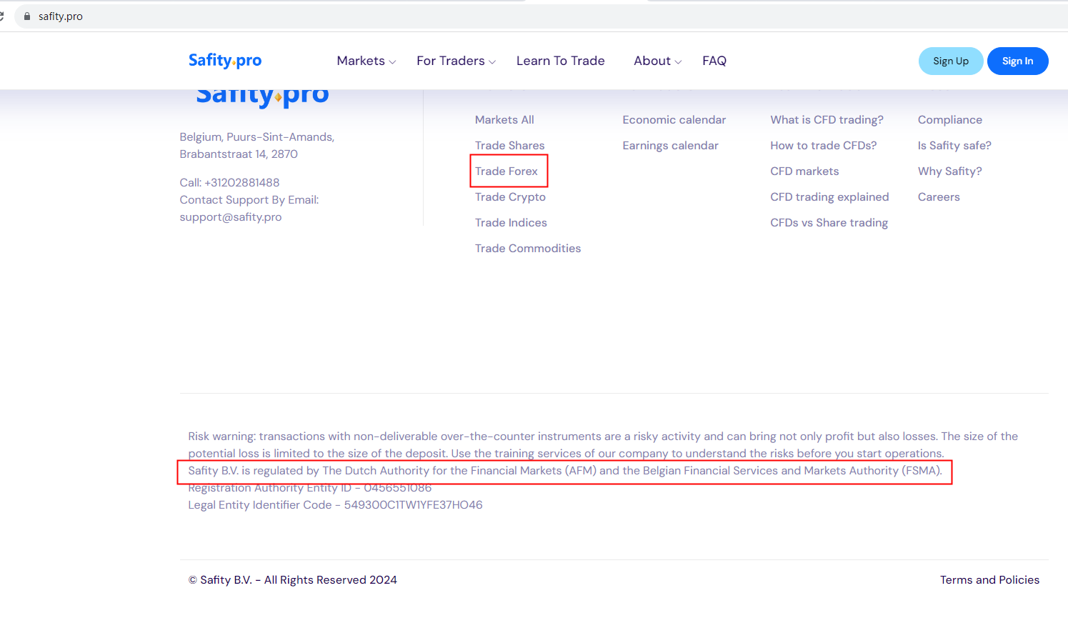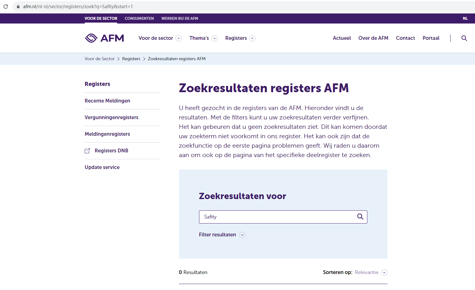 Safity claims to be regulated by the Dutch Authority for the Financial Markets (AFM) and the Belgian Financial Services and Markets Authority (FSMA), we searched the AFM but found no matching results.