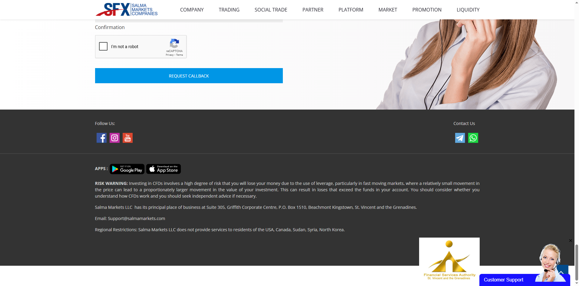 Salma Markets claims to operate as Salma Markets LLC and states it is registered with the Financial Services Authority (FSA) of Saint Vincent and the Grenadines. While our finding can prove this, please note that this registration only confers International Business Company (IBC) status. Importantly, such registration does not equate to financial licensing. The SVG FSA has explicitly clarified that it does not regulate or license foreign exchange brokers, meaning this registration offers no regulatory oversight or investor protection.