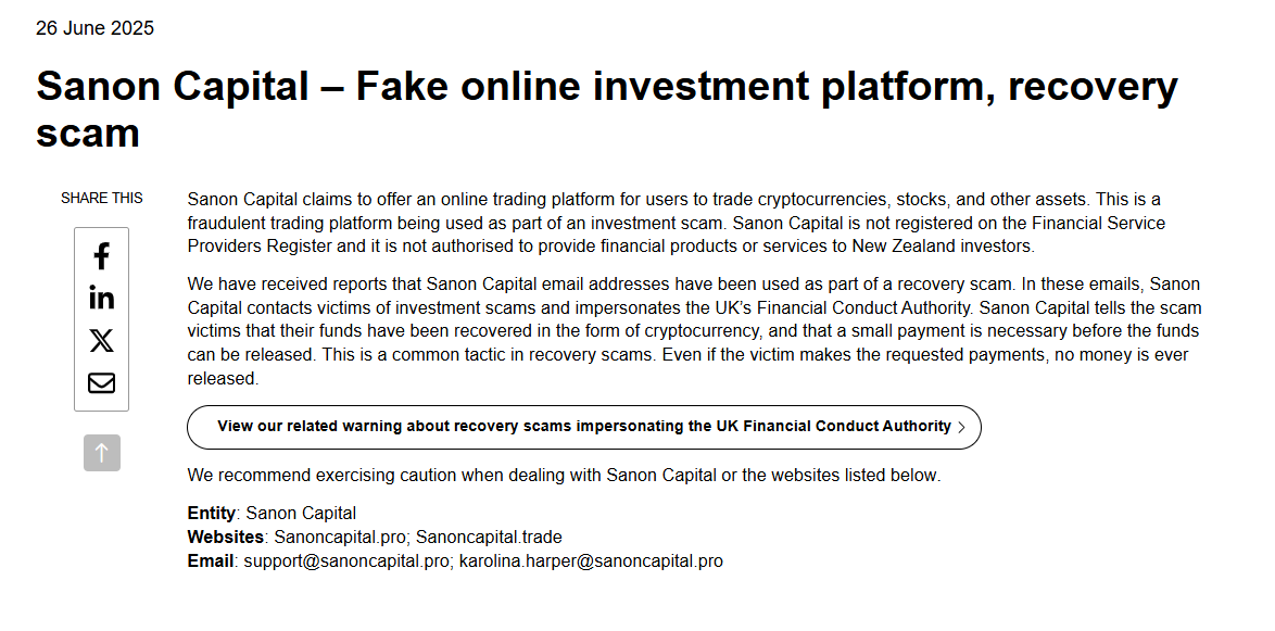 On 26 June 2025, the Financial Markets Authority (FMA) of New Zealand added Sanon Capital to its warning list, stating that the firm is not registered on the Financial Service Providers Register and is not authorized to offer financial products or services to New Zealand investors.