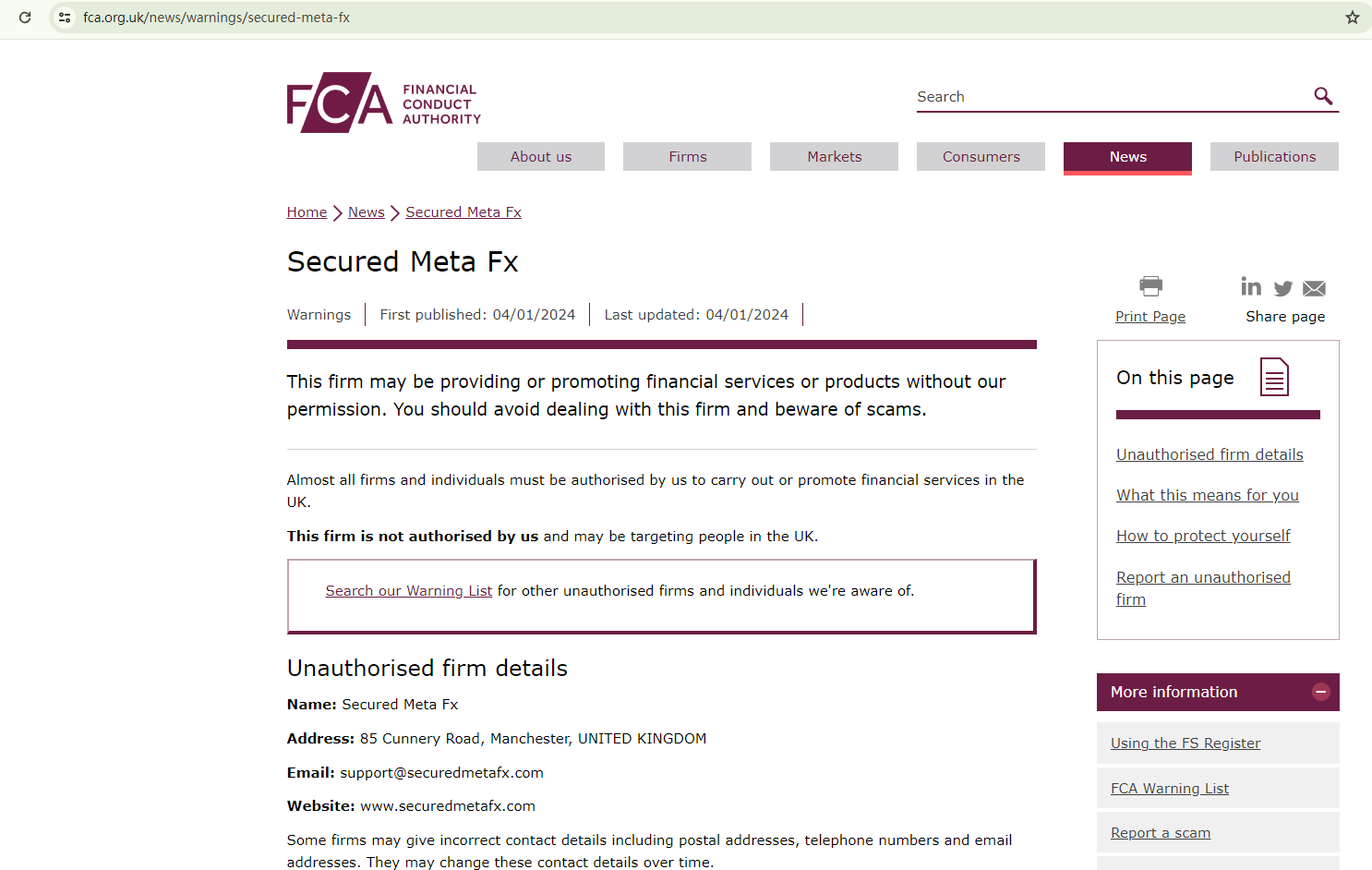 Despite claiming to have its headquarters in the UK, Secured Meta Fx is identified as an unauthorized firm by the Financial Conduct Authority (FCA).