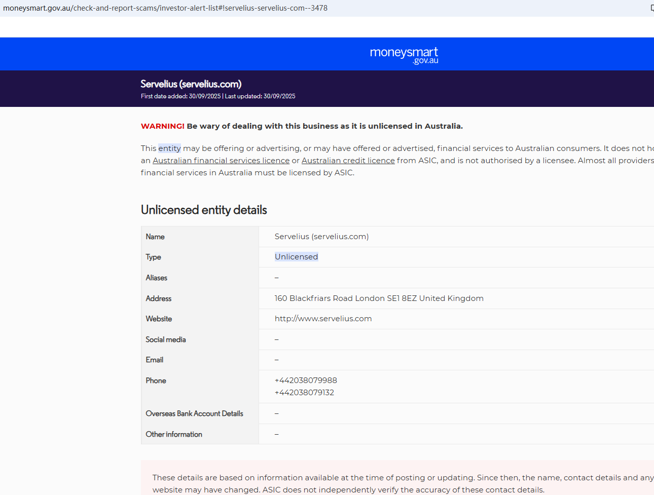 On Sept 30, 2025, the Australian Securities & Investments Commission (ASIC) issued a warning against Servelius, believing this company might be providing financial services or products without proper authorization. https://moneysmart.gov.au/check-and-report-scams/investor-alert-list#!servelius-servelius-com--3478