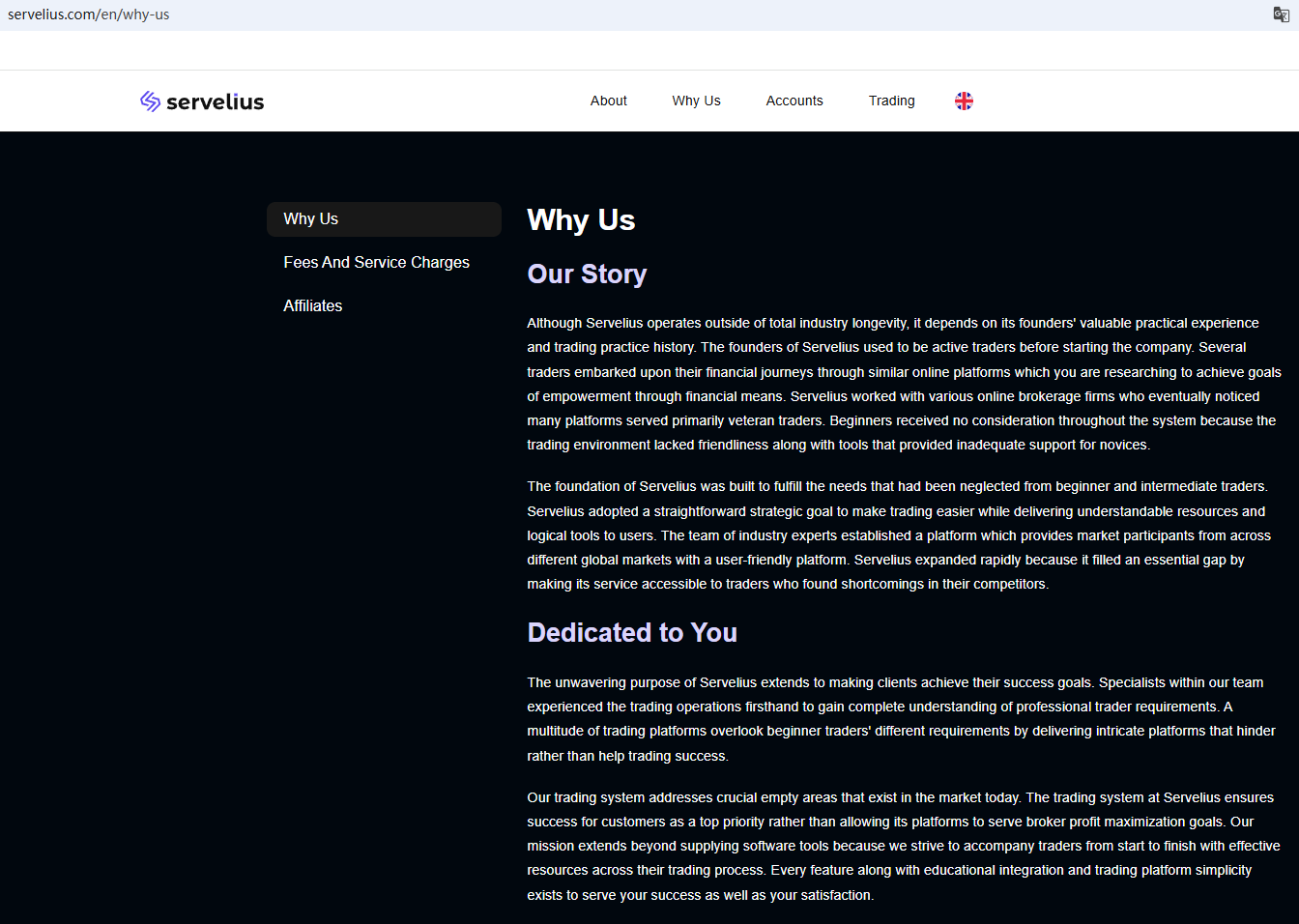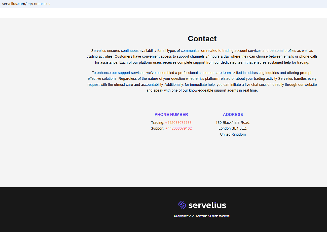 According to its website, it claims to be a reliable company, but it does not provide any valid regulatory information on the website. We checked the relevant regulatory authorities based on the office address provided, but did not find any matching information with the Financial Conduct Authority (FCA). In addition, the Australian Securities & Investments Commission (ASIC) issued a warning against Servelius, believing this company might be providing financial services or products without proper authorization.