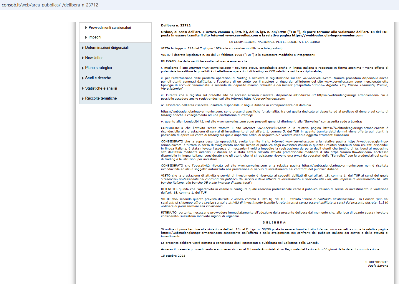 On Oct 15, 2025, the Italian Companies and Exchange Commission (CONSOB) ordered Servelius to be blacked out since it offers financial services illegally in Italy. https://www.consob.it/web/area-pubblica/-/delibera-n-23712