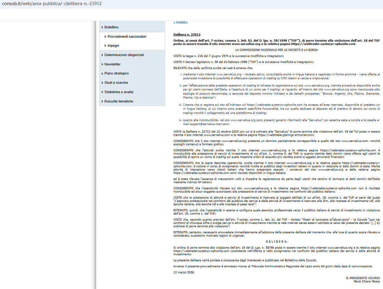 On March 12, 2025, the Italian Companies and Exchange Commission (CONSOB) ordered Servelius to be blacked out since it offers financial services illegally in Italy. https://www.consob.it/web/area-pubblica/-/delibera-n.-23912