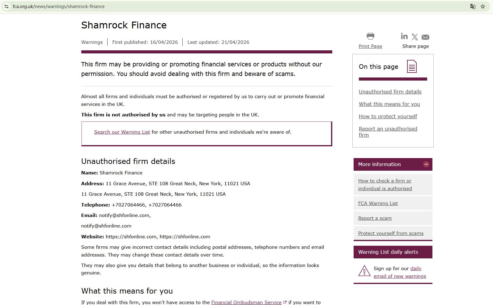 Besides, the Financial Conduct Authority (FCA) issued a warning against Shamrock Finance, believing this company might be providing financial services or products without proper authorization in the UK.