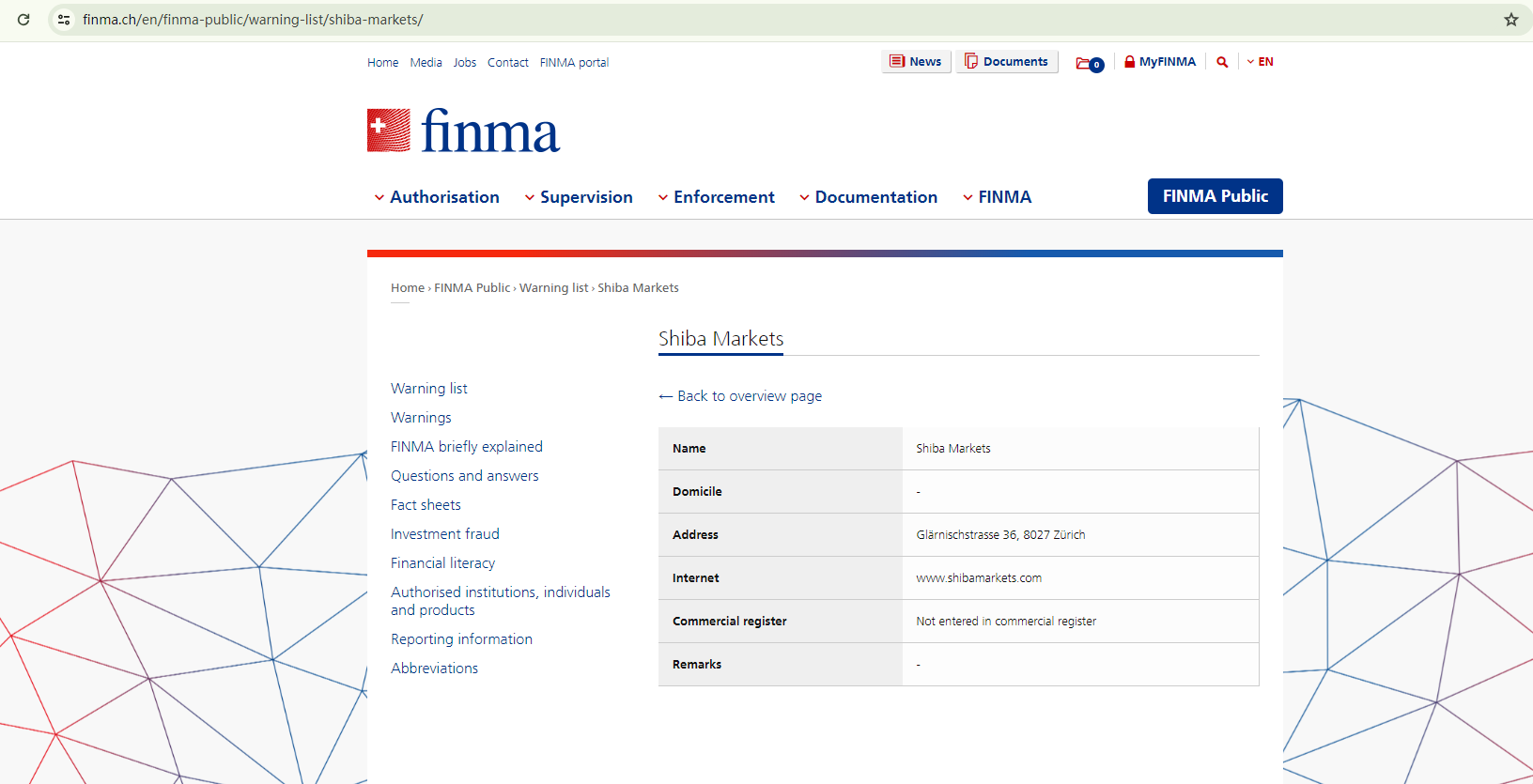 Shiba Markets purports to be a brokerage firm with operations in the UK, Switzerland, and Australia.However, upon verification with pertinent financial regulators - the Financial Conduct Authority (FCA), the Swiss Financial Market Supervisory Authority (FINMA), and the Australian Securities and Investments Commission (ASIC) - it appears that Shiba Markets is not registered with any of these authorities. In fact, FINMA has issued a public warning against Shiba Markets due to its unlicensed status.In essence, Shiba Markets is not regulated by any governing body. Entrusting it with investors' funds is highly risky, as there are no legal protections in place to safeguard the funds.Shiba Markets appears to be a scam.