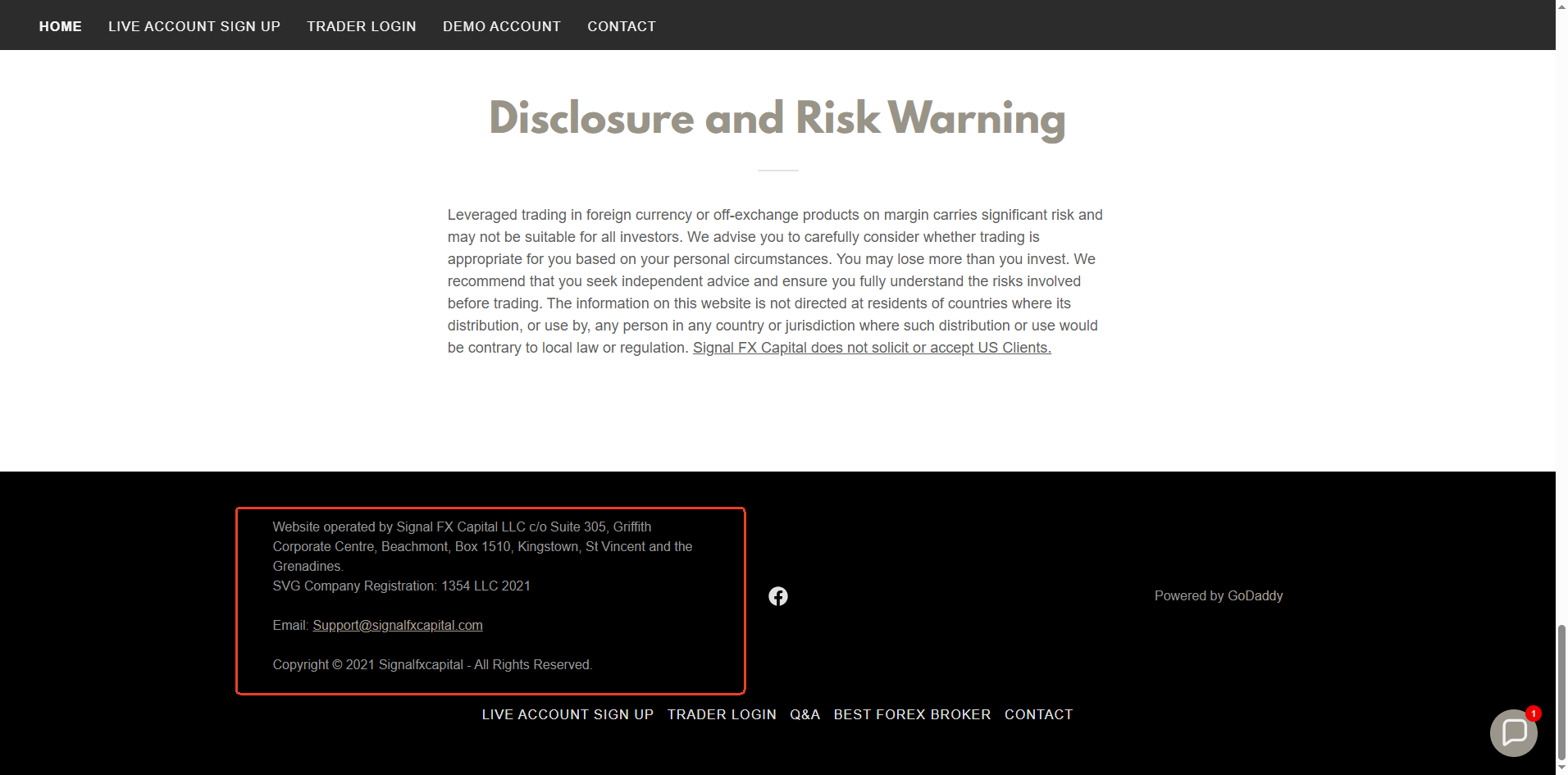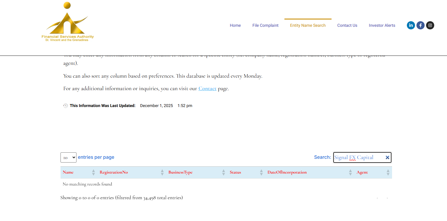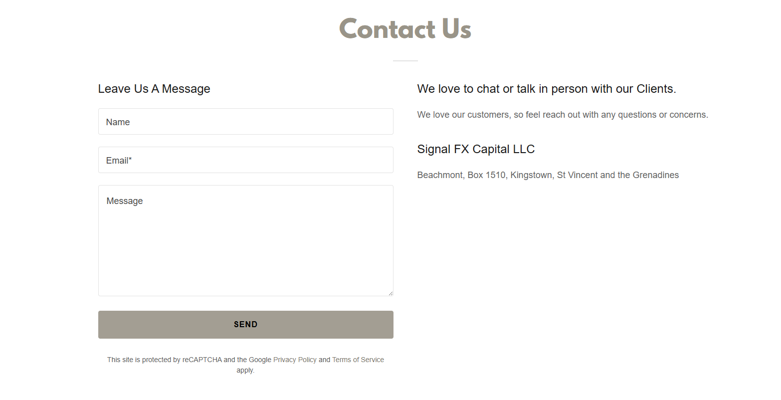 Signal FX Capital does not disclose any regulatory information and only claims to be registered in Saint Vincent and the Grenadines (SVG). However, our search of the official register of the Financial Services Authority (FSA) of Saint Vincent and the Grenadines found no record of Signal FX Capital LLC, suggesting the company may not even be properly registered. Moreover, even if such a registration were to exist, it is important to understand that SVG FSA registrations confer only International Business Company (IBC) status, which does not amount to a valid financial services or forex trading license.