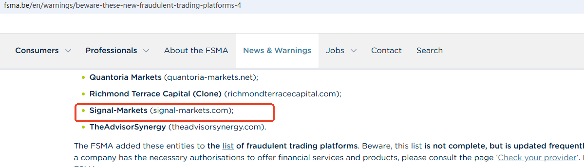 On March 12, 2026, the Financial Services and Markets Authority (FSMA) issued a warning about Signal Markets for the lack of the required authorization. https://www.fsma.be/en/warnings/beware-these-new-fraudulent-trading-platforms-4