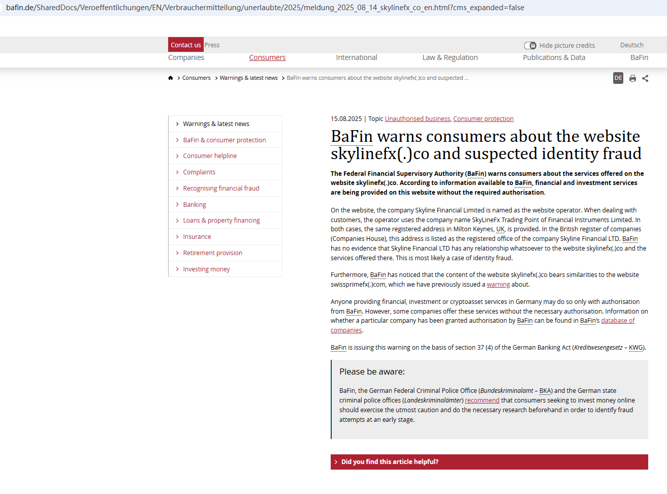 SkylineFx claims on its website to be a brand owned and operated by Skyline Financial Limited. Ironically, upon investigation, we discovered that Skyline Financial Limited has published a disclaimer on its website stating that SkylineFx has no connection to it and is likely impersonating Skyline Financial Limited to conduct financial services. Investors are advised to be cautious and stay away from SkylineFx. Furthermore, the Federal Financial Supervisory Authority (BaFin) issued a warning against SkylineFx for the lack of the required authorization.