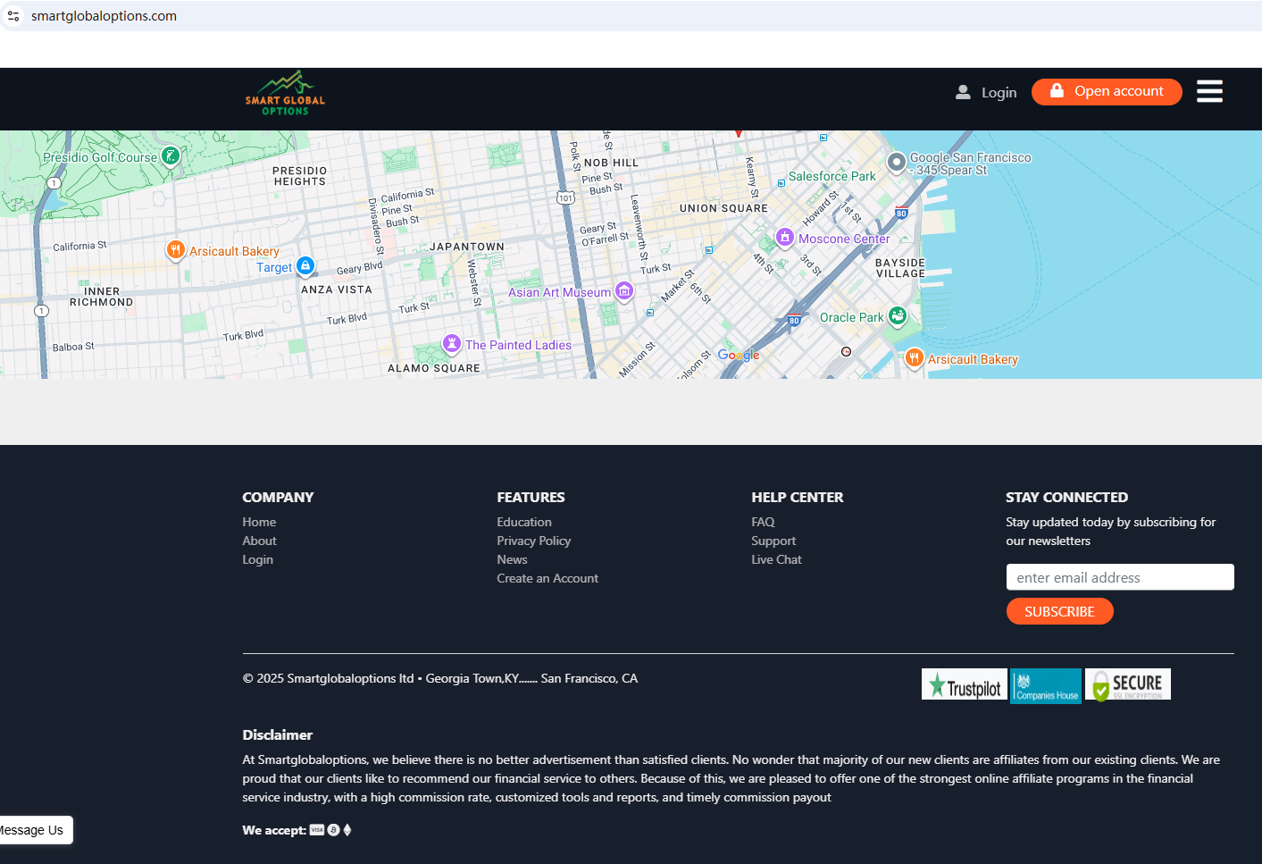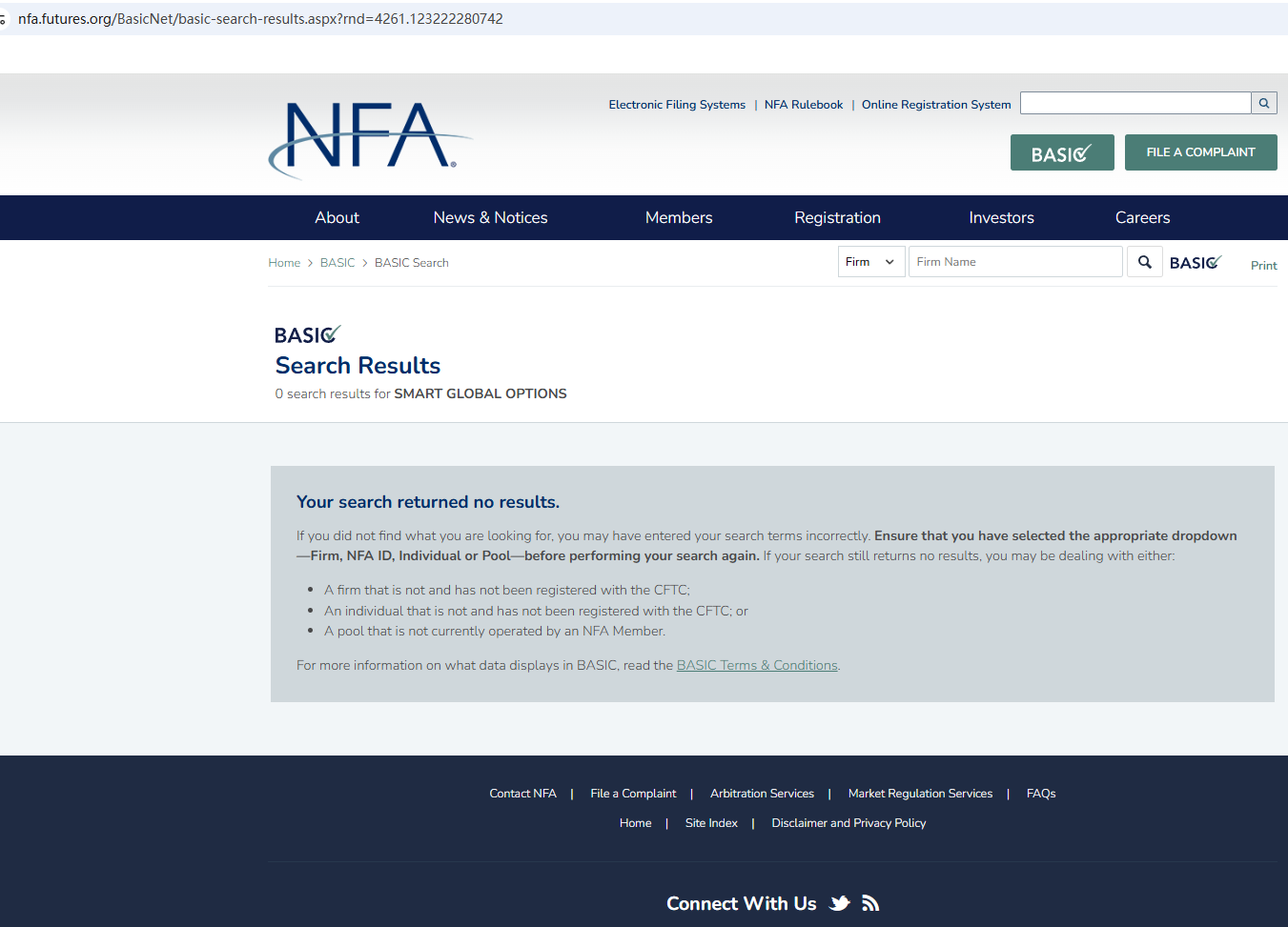 According to its website, it is located in the US. Upon investigation, no matching information was found in the National Futures Association (NFA). In addition, the Financial Conduct Authority (FCA) issued a warning regarding Smart Global Options, suspecting that this company may be offering financial services or products without the necessary authorization.