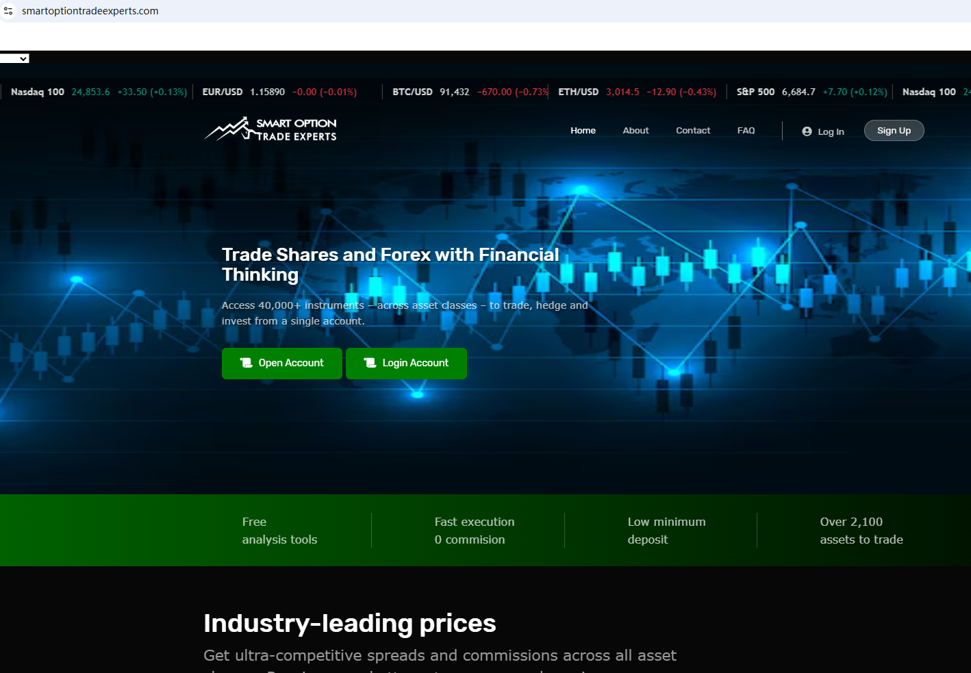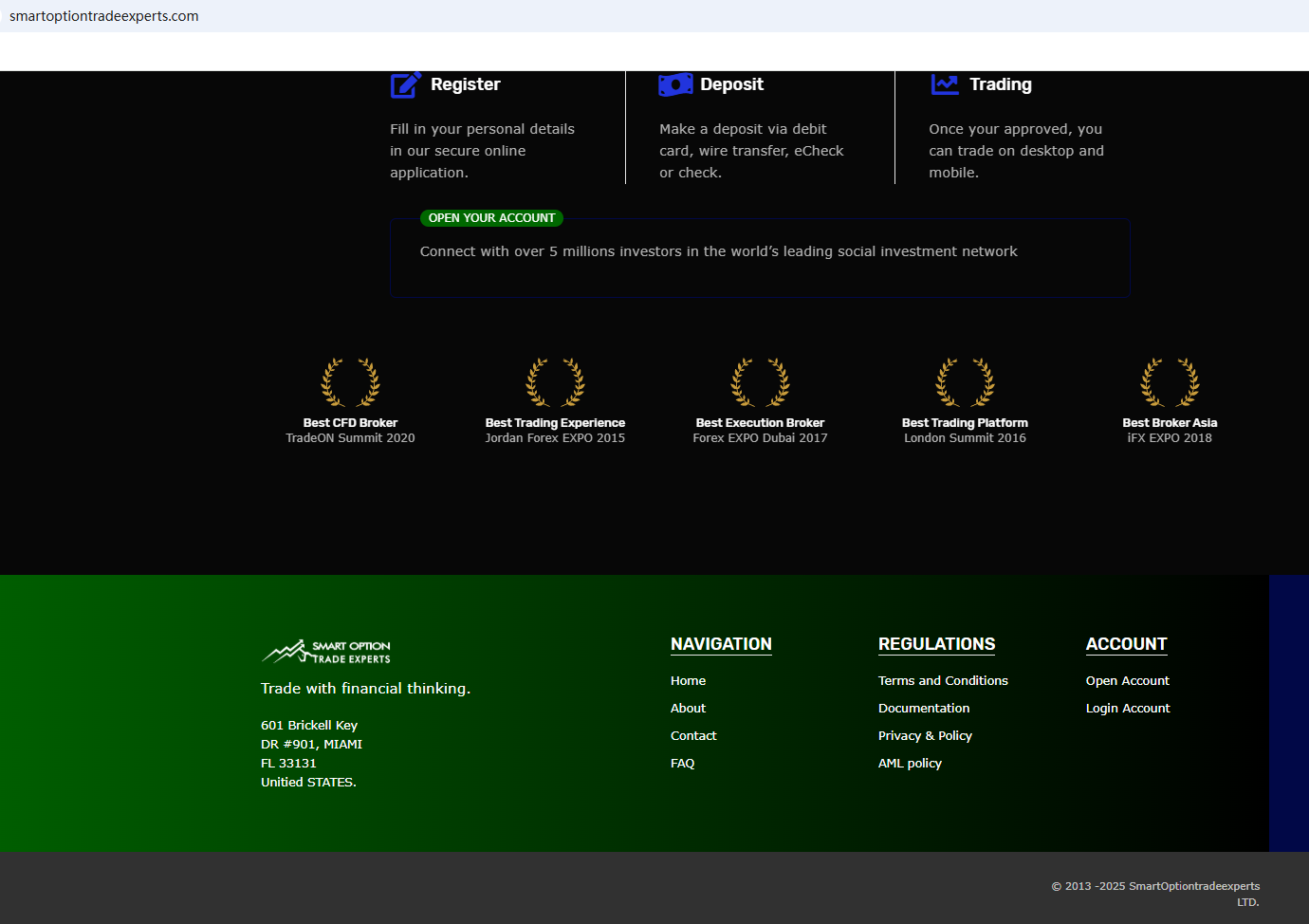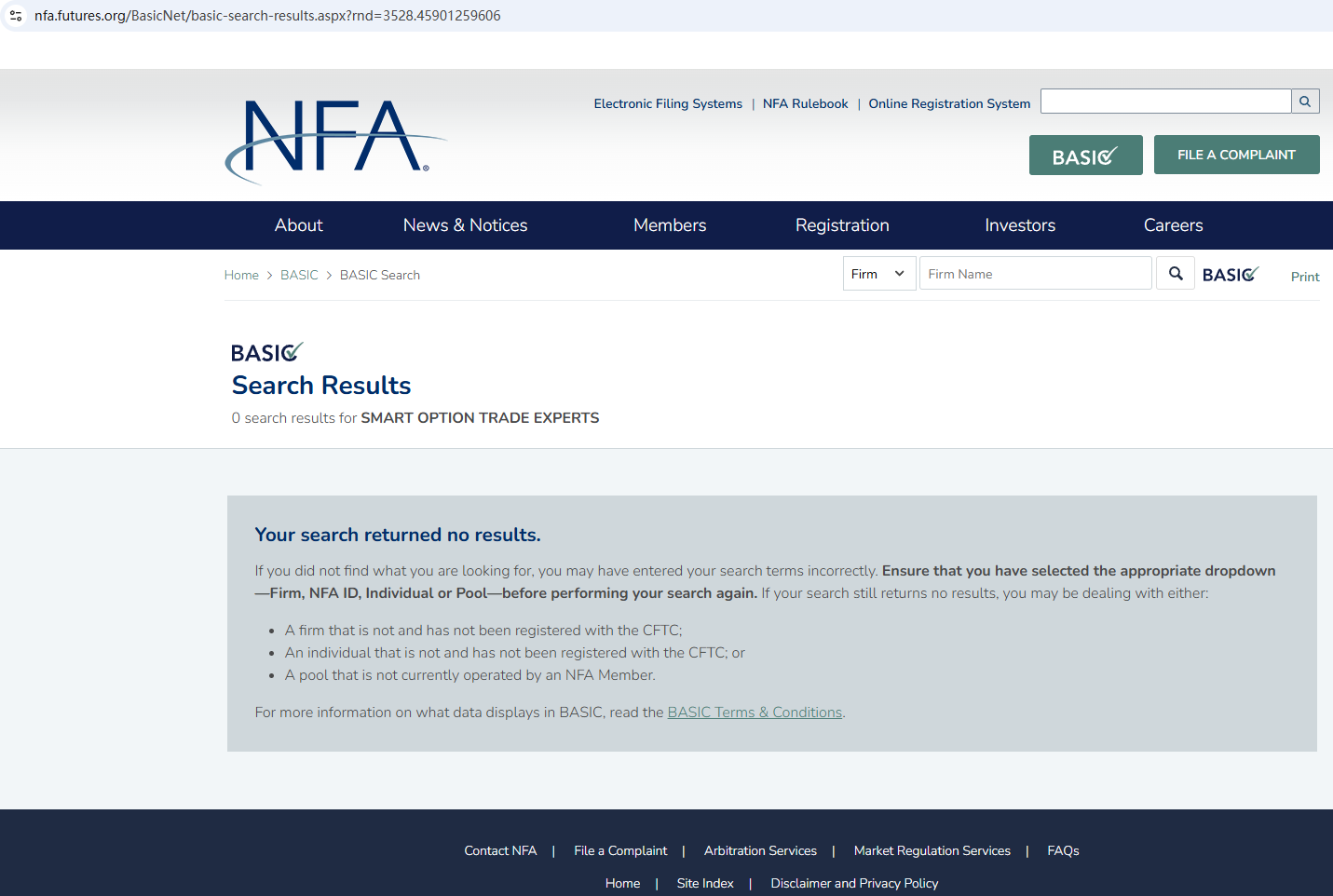According to its website, it claims to be regulated in the UK, with its office located in the US. Upon investigation, no matching information was found in the National Futures Association (NFA). In addition, the Financial Conduct Authority (FCA) issued a warning regarding SMART OPTION TRADE EXPERTS, suspecting that this company may be offering financial services or products without the necessary authorization.