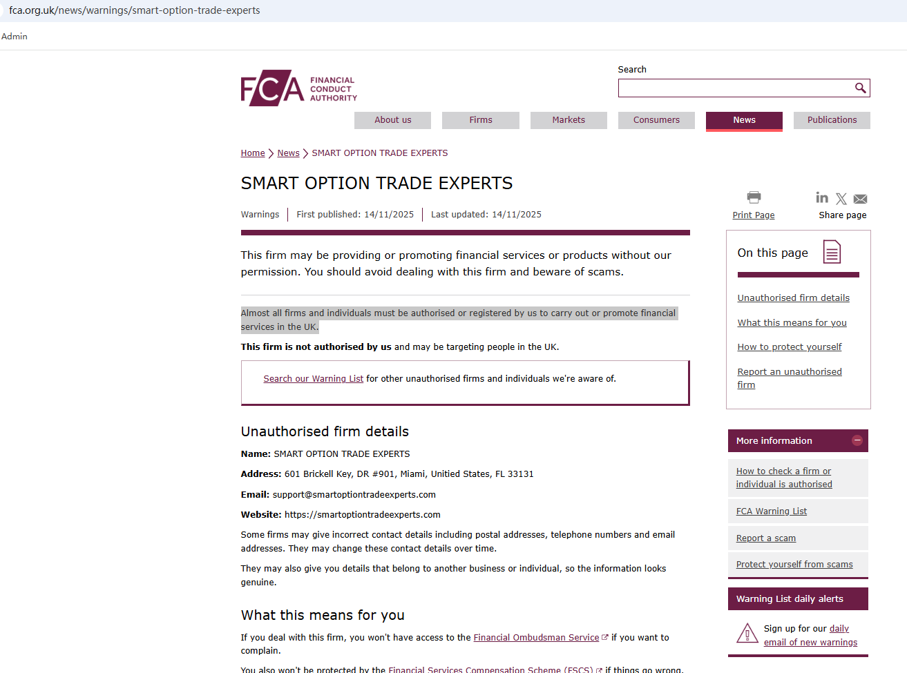 On Nov 14, 2025, the Financial Conduct Authority (FCA) issued a warning regarding SMART OPTION TRADE EXPERTS, suspecting that this company may be offering financial services or products without the necessary authorization. https://www.fca.org.uk/news/warnings/smart-option-trade-experts
