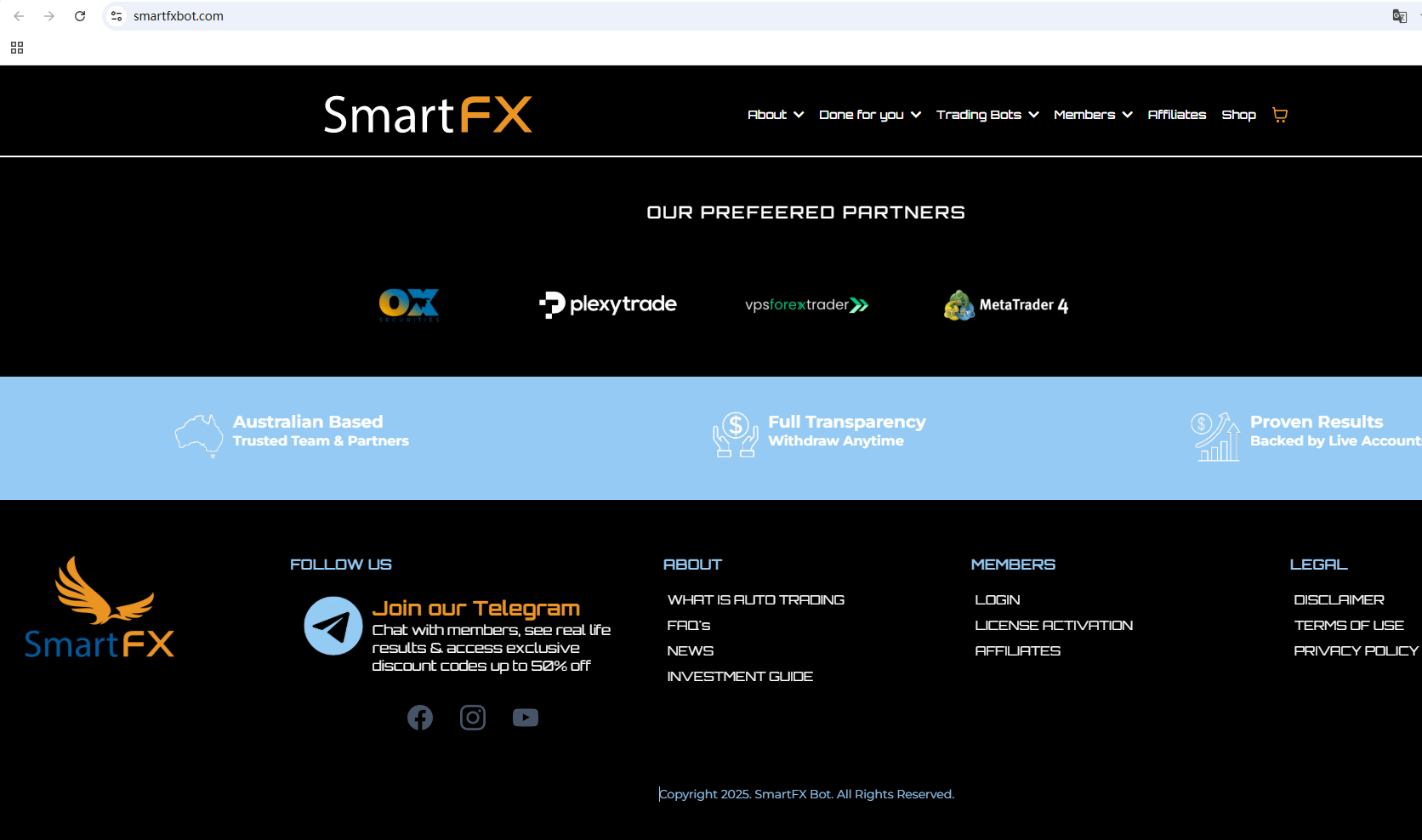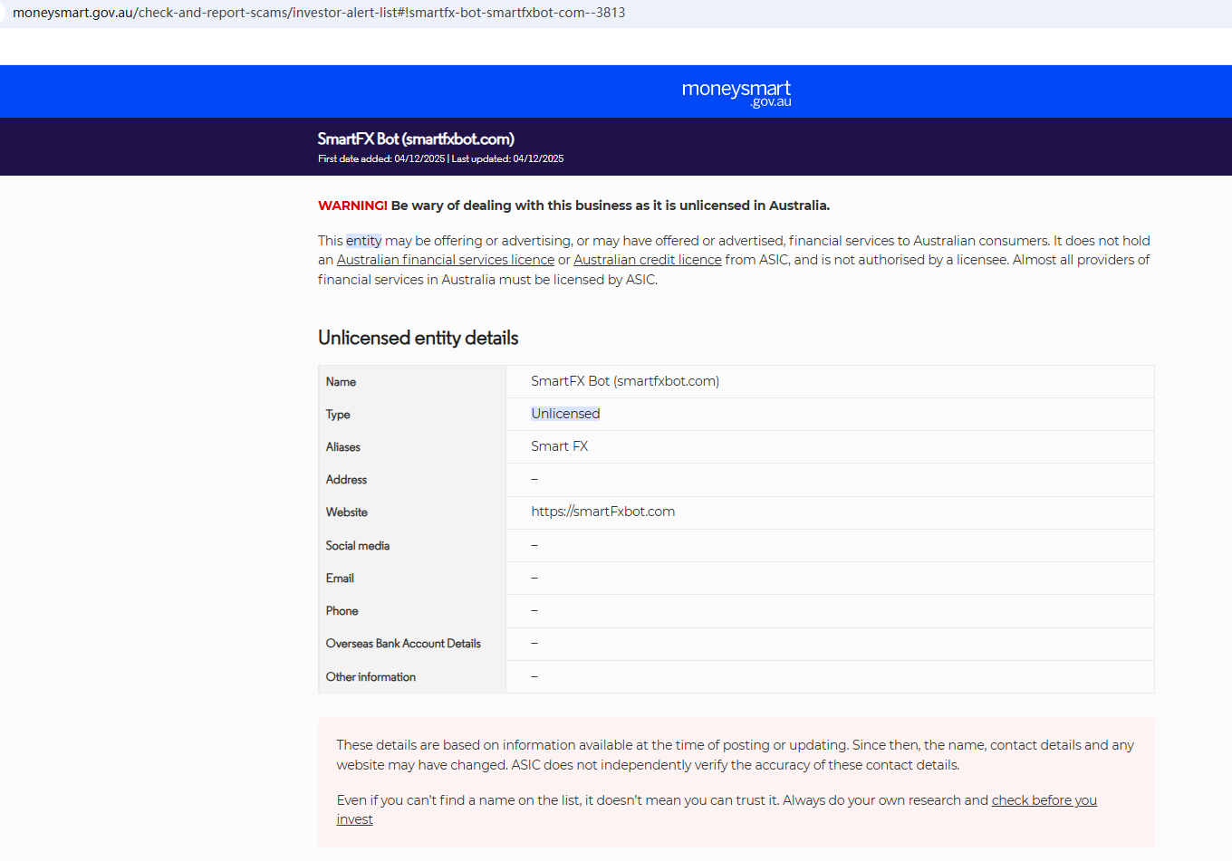 On Dec 4, 2025, the Australian Securities & Investments Commission (ASIC) issued a warning against SmartFX Bot, believing this company might be providing financial services or products without proper authorization. https://moneysmart.gov.au/check-and-report-scams/investor-alert-list#!smartfx-bot-smartfxbot-com--3813