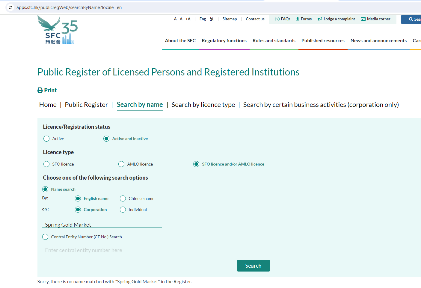 We searched the HONG KONG Securities and Futures Commission (HK SFC) but found no matching results.