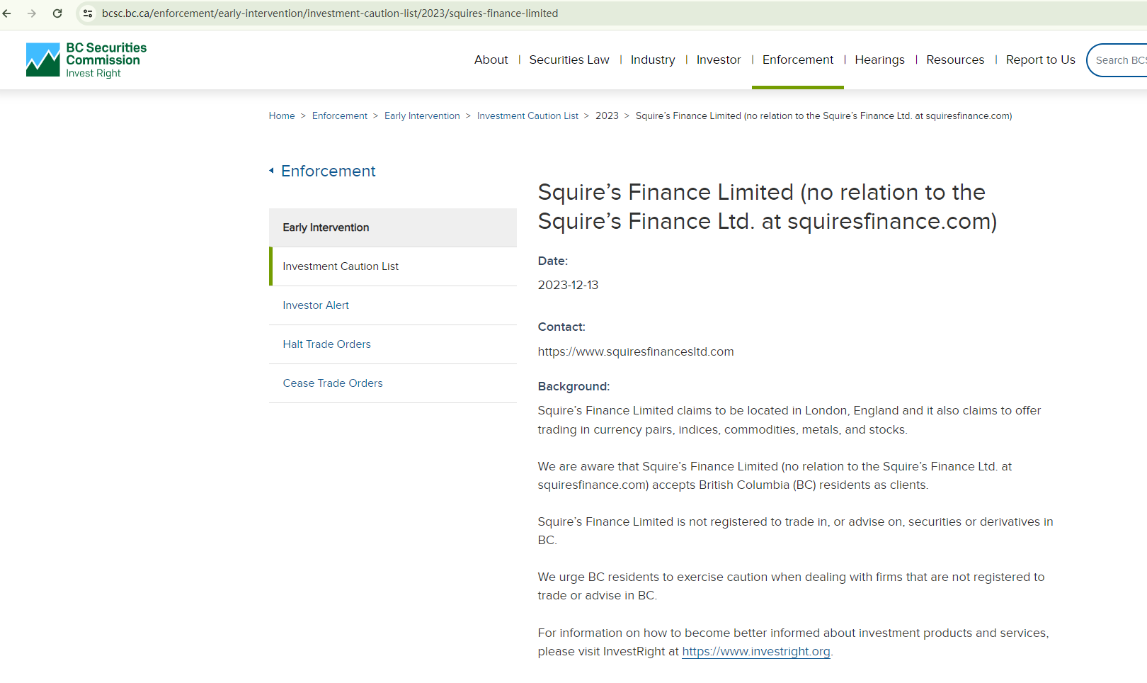 The Financial Conduct Authority (FCA) has issued a warning against squiresfinanceltd.com, identifying this broker as a clone of an FCA-authorized firm. Therefore, information on this fraudulent platform is unreliable.In essence, squiresfinanceltd.com is not regulated by any governing body. Entrusting this broker with investors' funds is highly risky, as there are no legal protections in place to safeguard the funds. It is unequivocally a scam.