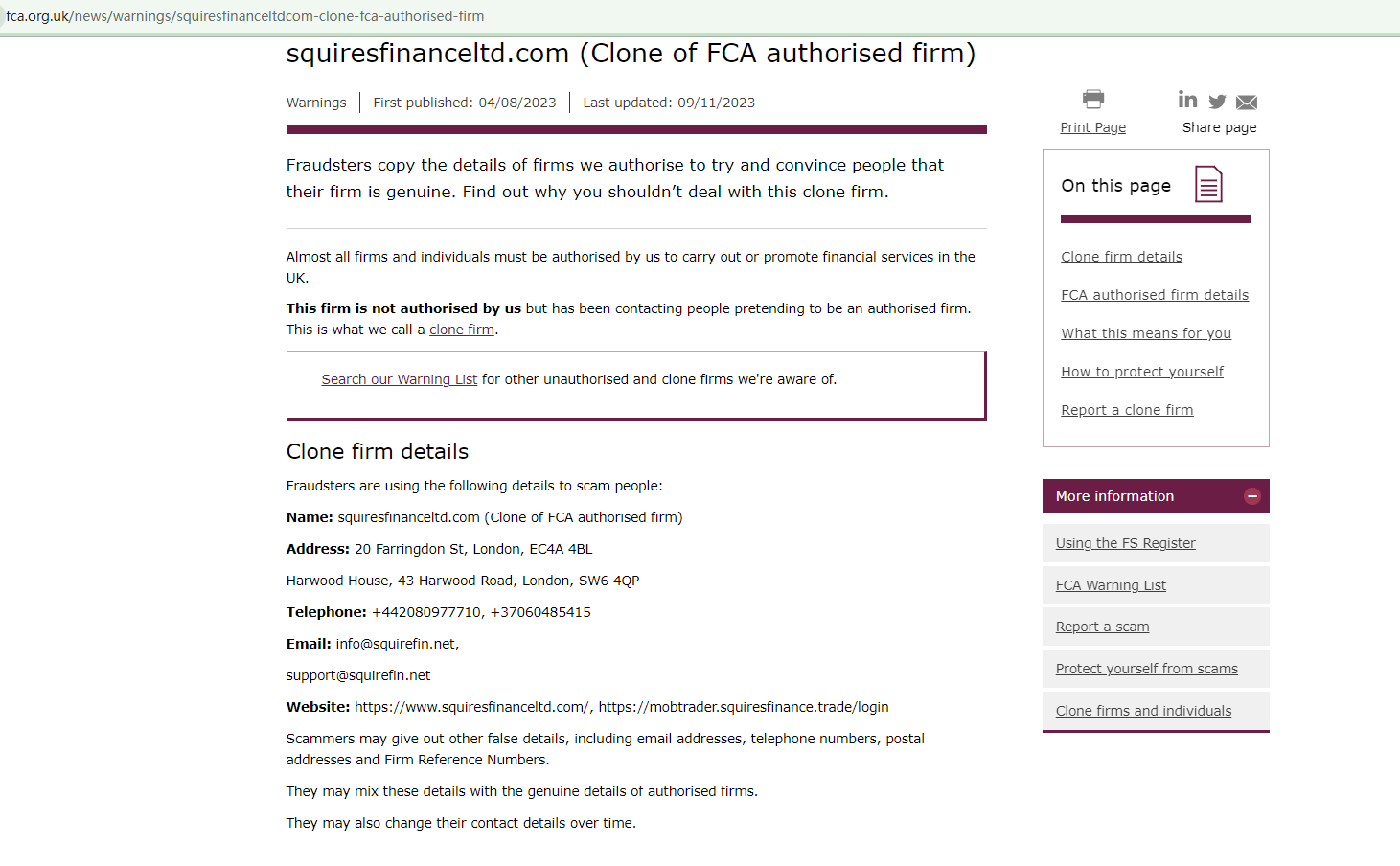 The Financial Conduct Authority (FCA) has issued a warning against squiresfinanceltd.com, identifying this broker as a clone of an FCA-authorized firm. Therefore, information on this fraudulent platform is unreliable.