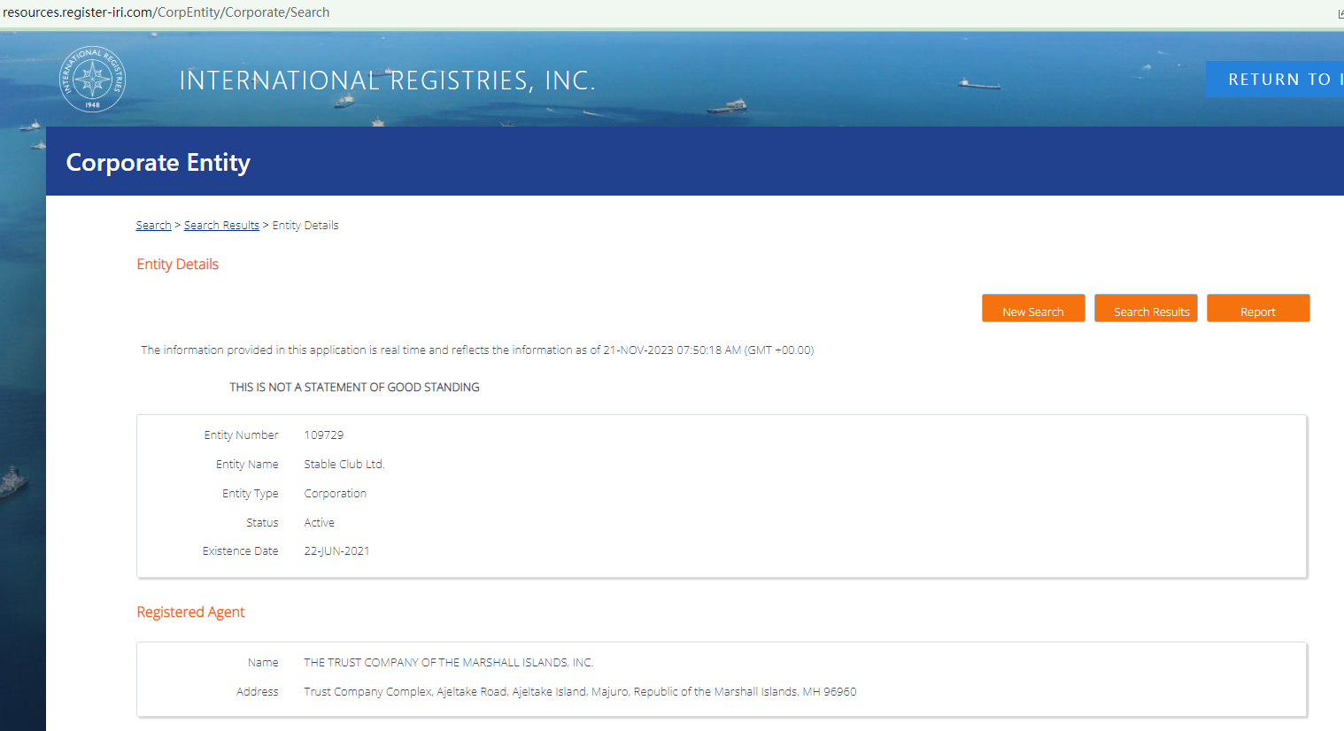 While Stable Club's registration with the Marshall Islands Registry (IRI) remains active, it is important to note that Stable Club is still an unregulated forex broker. The IRI is a privately held maritime and corporate registry service provider that does not have the authority to issue licenses for or regulate forex trading activities. Mere registration with the IRI does not equate to authorization to provide financial services or products.