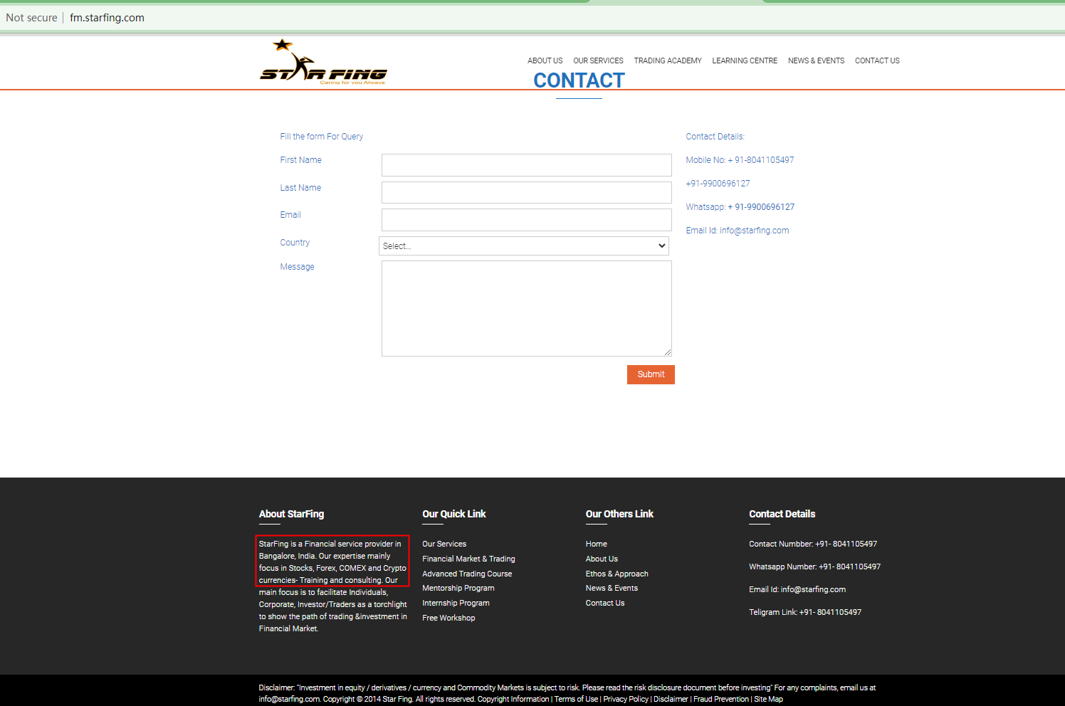 StarFing marks itself as a financial services provider based in India, as well as a traing platform that teaches knowledge about trading.