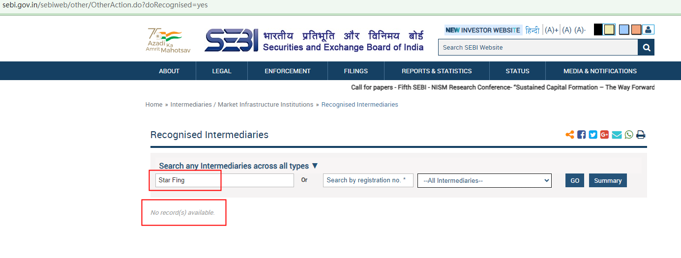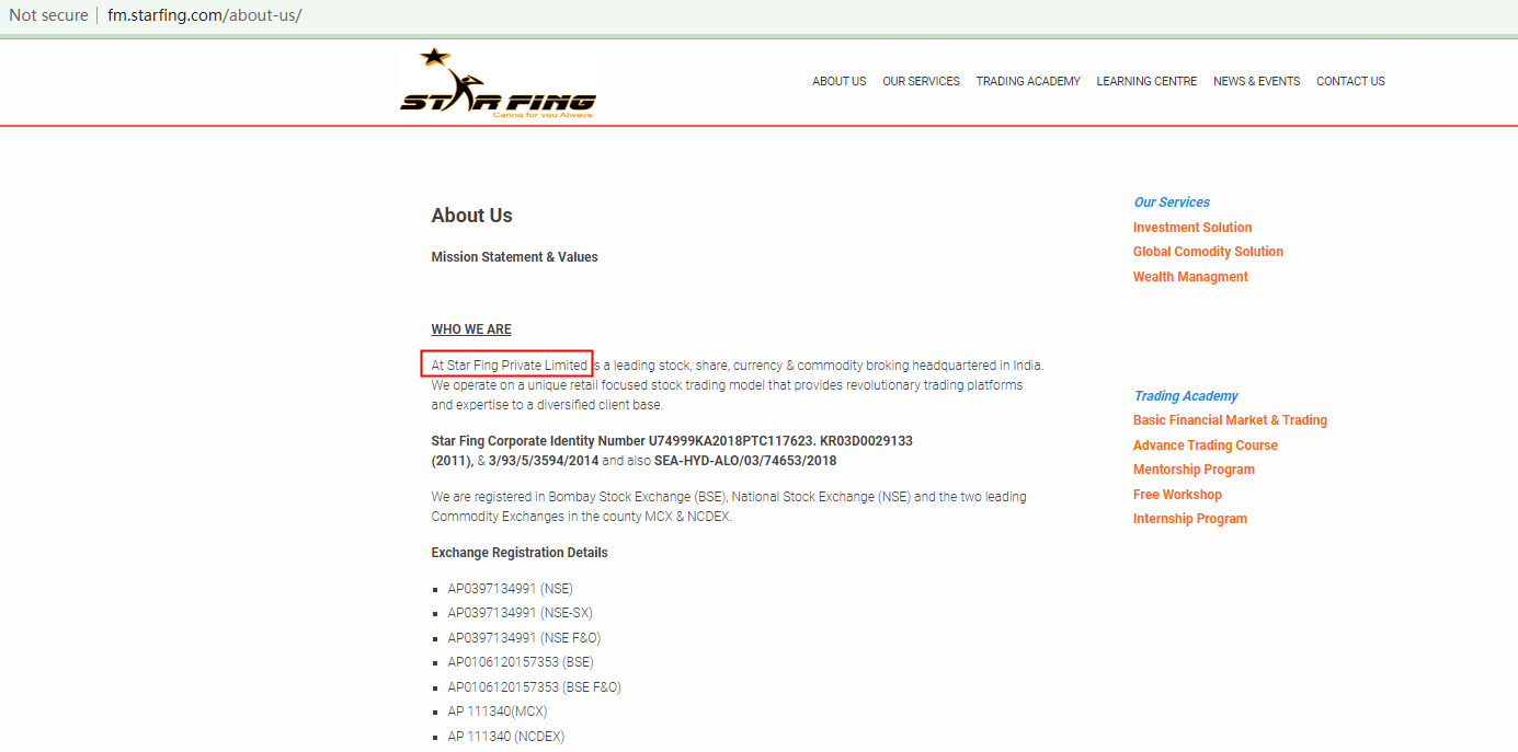 It purports to be registered in "Bombay Stock Exchange (BSE), National Stock Exchange (NSE) and the two leading Commodity Exchanges in the county MCX & NCDEX." However, they are all financial market institutions in India, not financial regulators. Even if the registration were true, it could not support StarFing's legitimacy in this industry within this jurisdiction. A Forex broker in India needs to acquire a license from the Securities and Exchange Board of India (SEBI). However, our search for the company Star Fing Private Limited didn't yield any results. This means it is not financially registered in India.