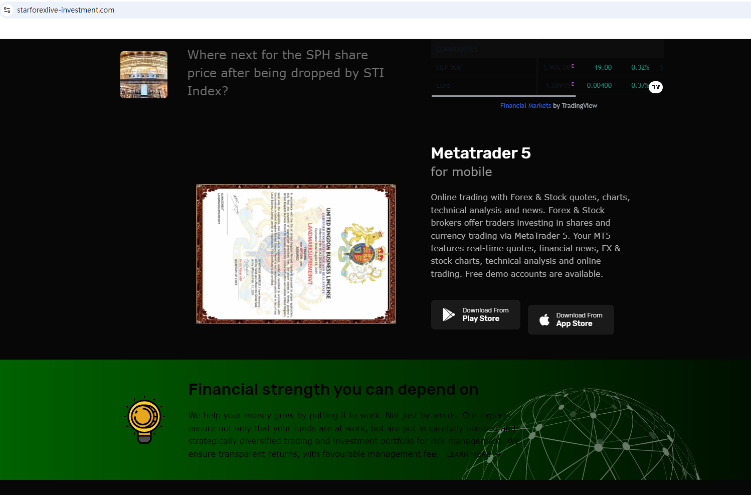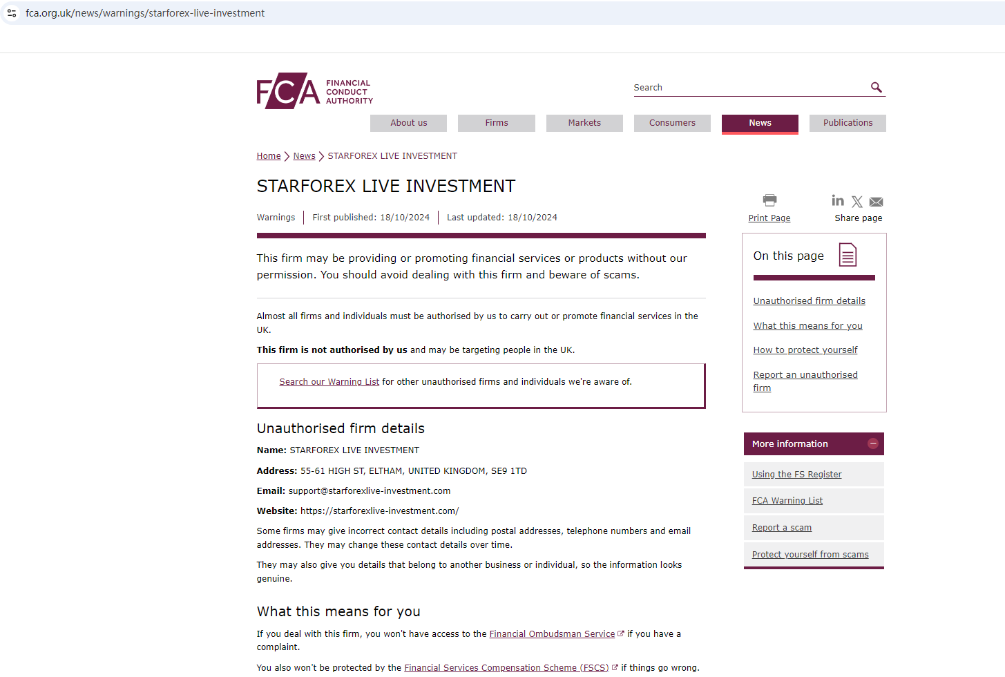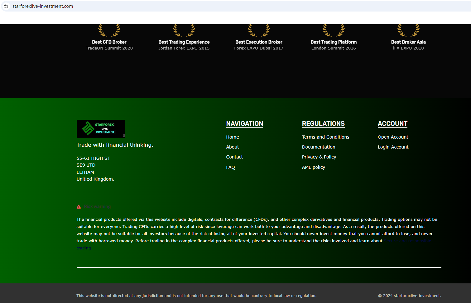 The website template used by the company is a generic "scam website" template. Such templates usually have the same layout design, logo design, text description, etc., and have been marked by Brokersview many times before. Although it displays a certificate from Companies House (CH) on the website, the name of the certificate is not the company's name, and CH does not regulate foreign exchange.What's more, the United Kingdom Financial Conduct Authority (FCA) issued a warning against STARFOREX LIVE INVESTMENT, believing this company might be providing financial services or products without authorisation in the UK.The truth is that STARFOREX LIVE INVESTMENT is not regulated by any regulators. Letting it hold or control investors'money is unsafe, and the money can not be protected by any laws.STARFOREX LIVE INVESTMENT is a scam.