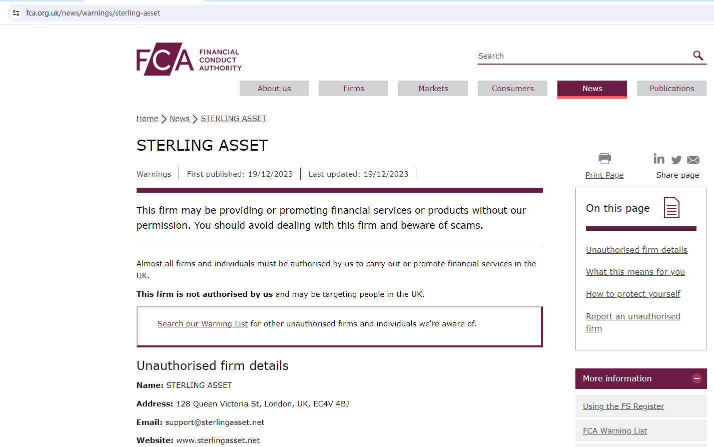 The United Kingdom Financial Conduct Authority (UK FCA) issued a warning that Sterling Asset was providing finacial services or products without authorisation.