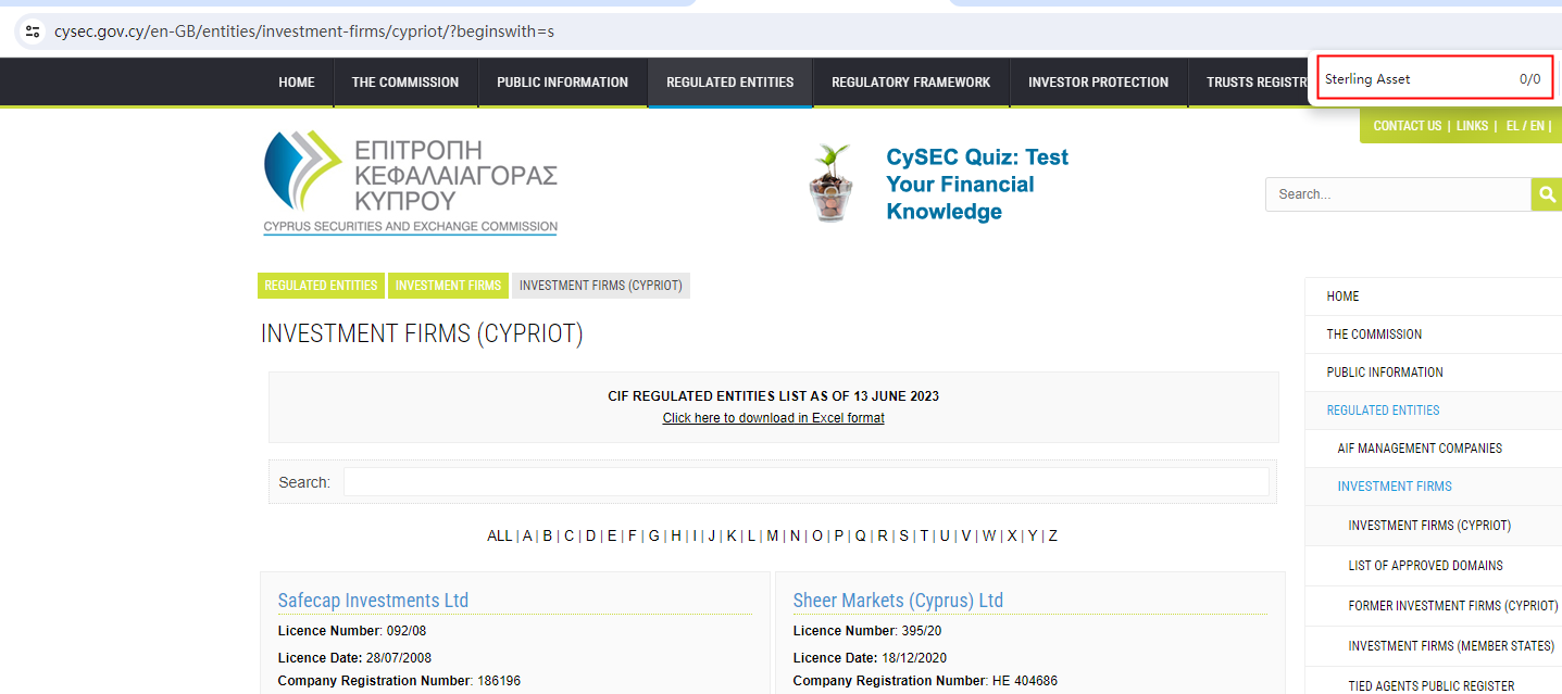 Sterling Asset claims to be regulated by the Cyprus Securities and Exchange Commission (CySEC), the Federal Financial Supervisory Authority (BaFin), the Financial Services Commission, Mauritius (FSC) and the Seychelles Financial Services Authority (FSA).We searched these regulators but found no matching results, it is a red flag.The United Kingdom Financial Conduct Authority (UK FCA) issued a warning that Sterling Asset was providing finacial services or products without authorisation.The truth is that Sterling Asset is not regulated by any regulators. Letting it hold or control investors' money is unsafe, and the money can not be protected by any laws.Sterling Asset is a scam.