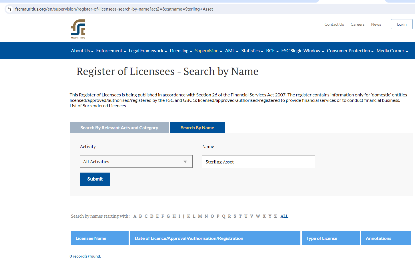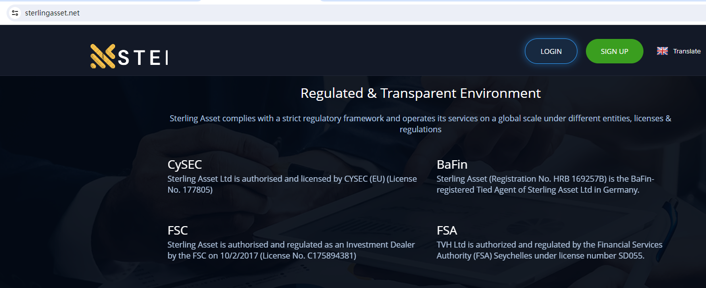 Sterling Asset claims to be regulated by the Cyprus Securities and Exchange Commission (CySEC), the Federal Financial Supervisory Authority (BaFin), the Financial Services Commission, Mauritius (FSC) and the Seychelles Financial Services Authority (FSA).