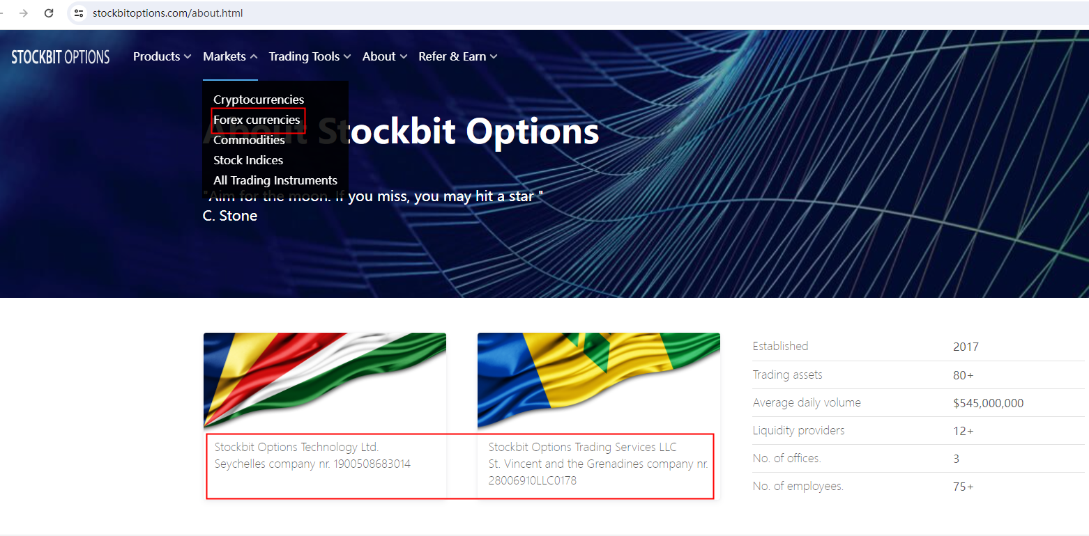 Stockbit Options claims to be regulated by the Seychelles Financial Services Authority (FSA) and the Financial Services Authority (FSA) of Saint Vincent and the Grenadines.But we don't find any results on these regulators matching to Stockbit.The truth is that Stockbit Options is not under valid regulation by any regulators to do forex. Investors' funds in this broker are unsafe and cannot be protected by any law.Stockbit Options is a scam.