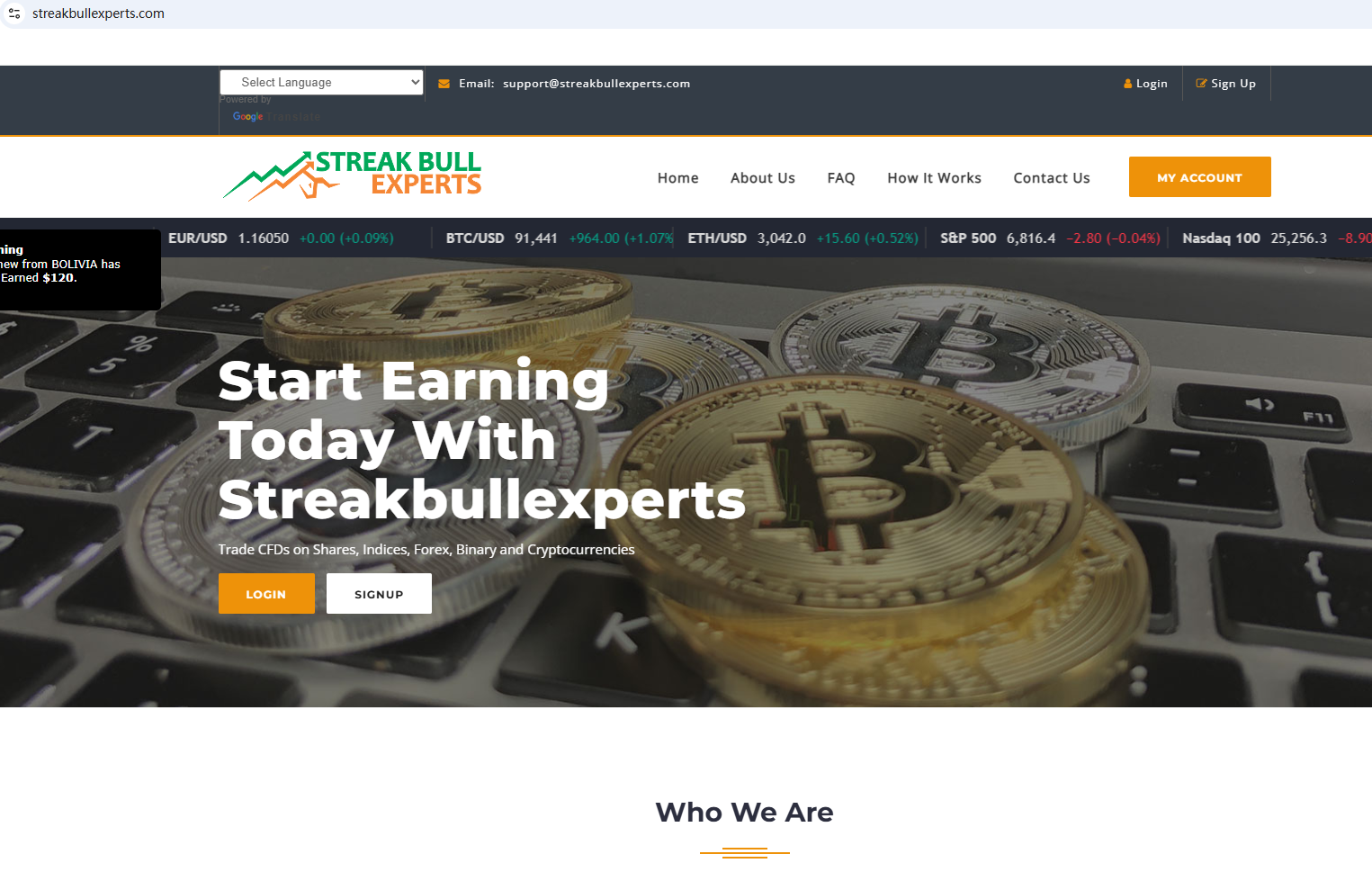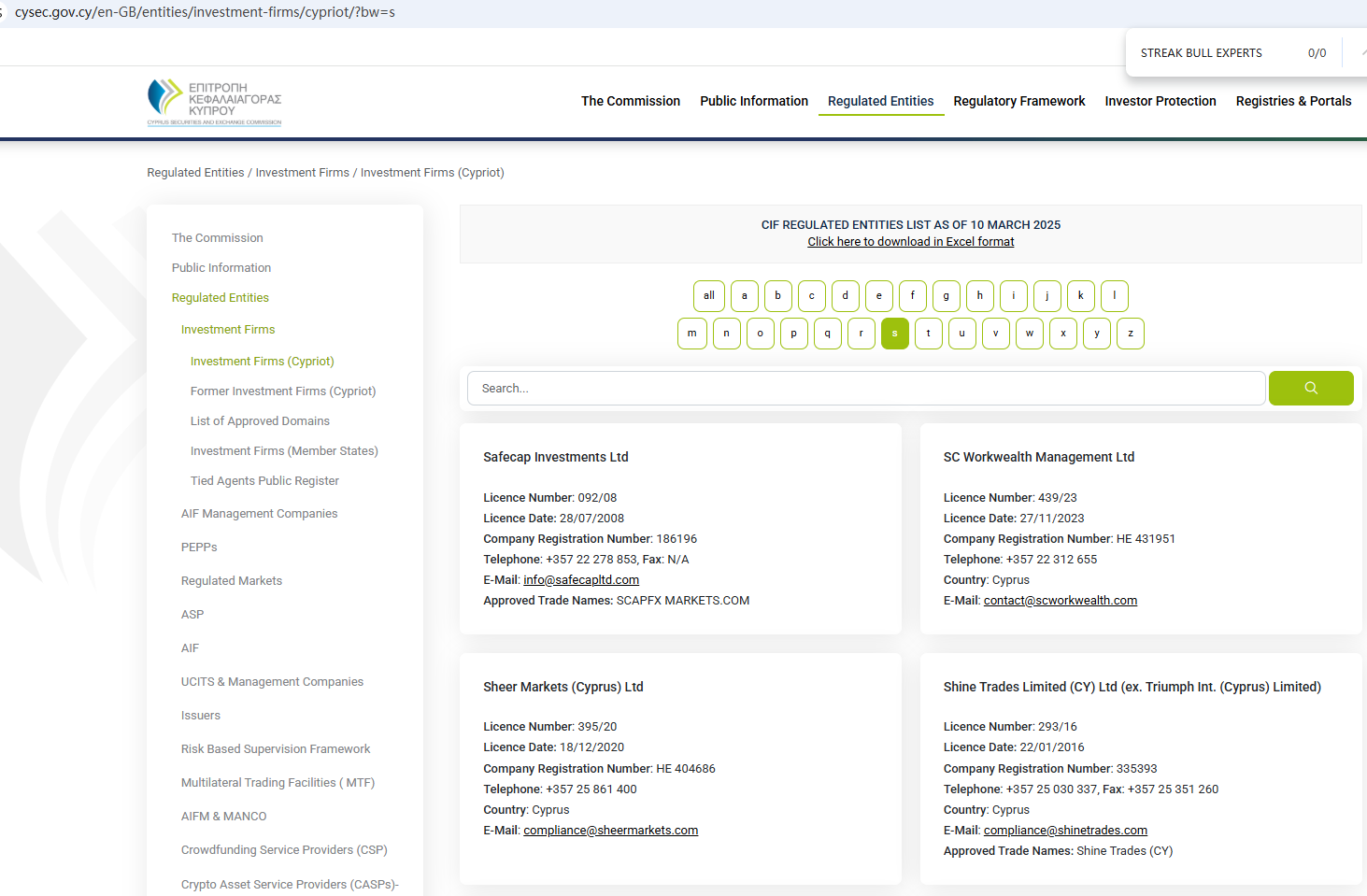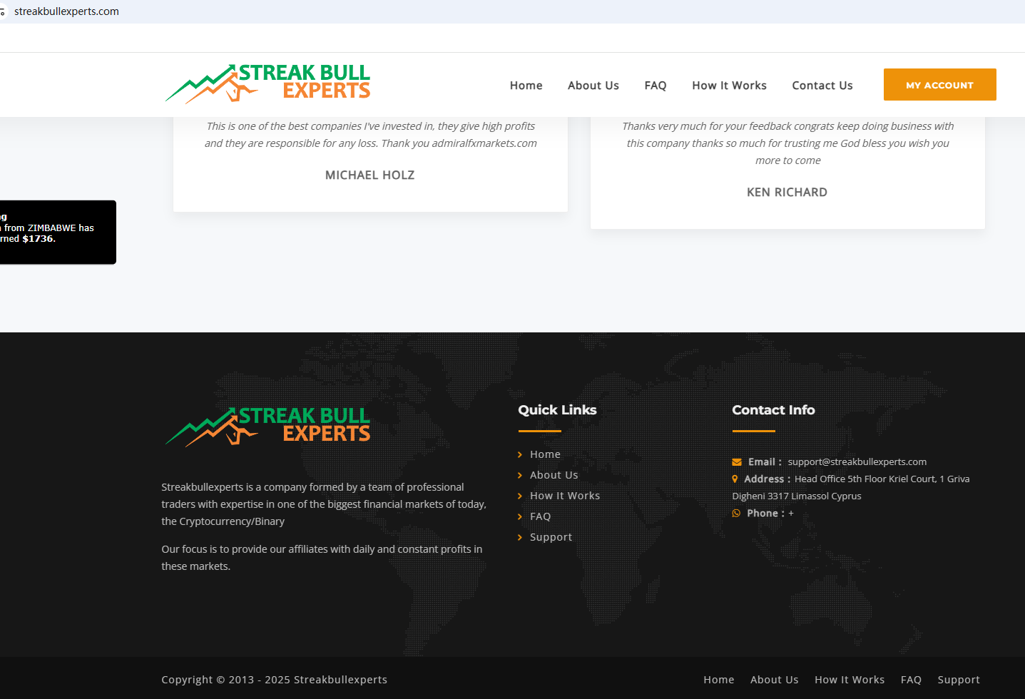 According to its website, it is located in Cyprus. Upon investigation, no matching information was found in the Cyprus Securities and Exchange Commission (CySEC). In addition, the Financial Conduct Authority (FCA) issued a warning regarding STREAK BULL EXPERTS, suspecting that this company may be offering financial services or products without the necessary authorization.