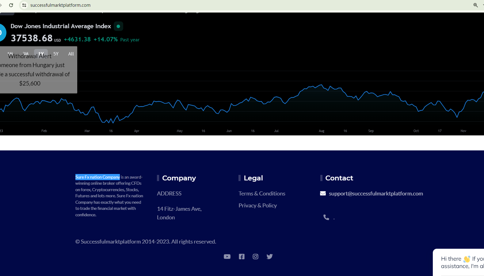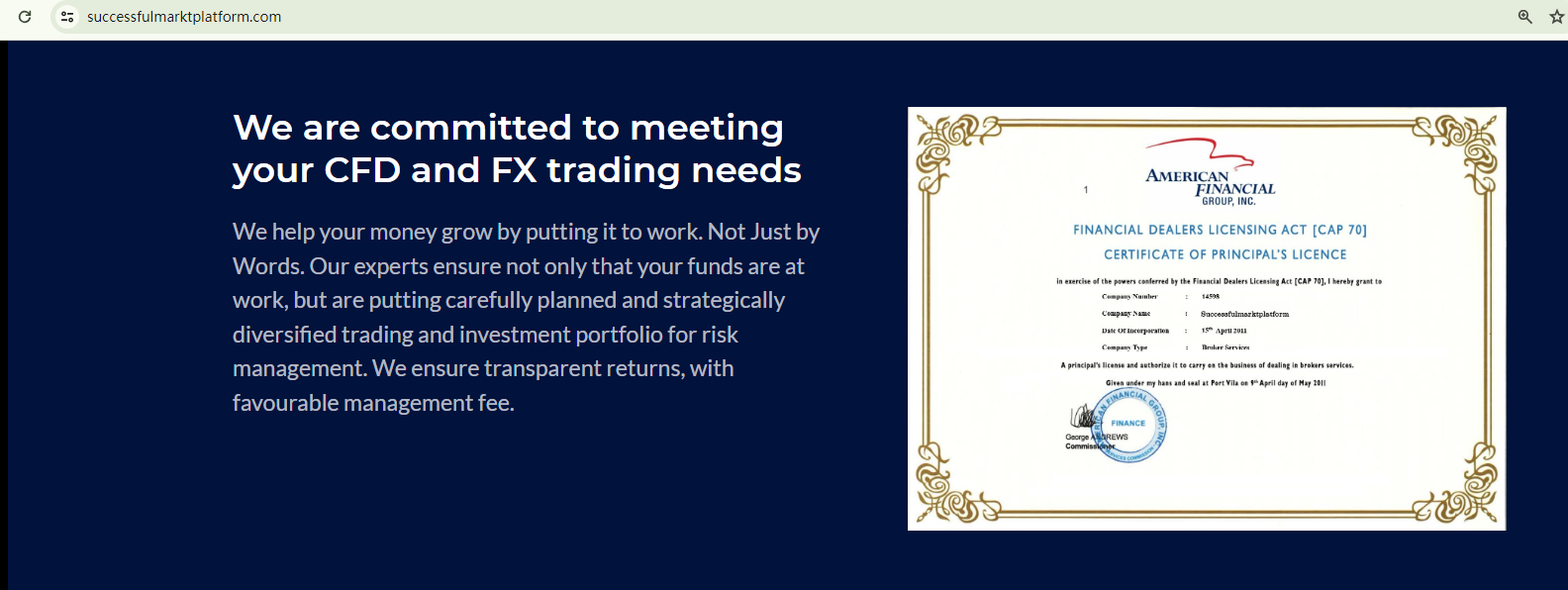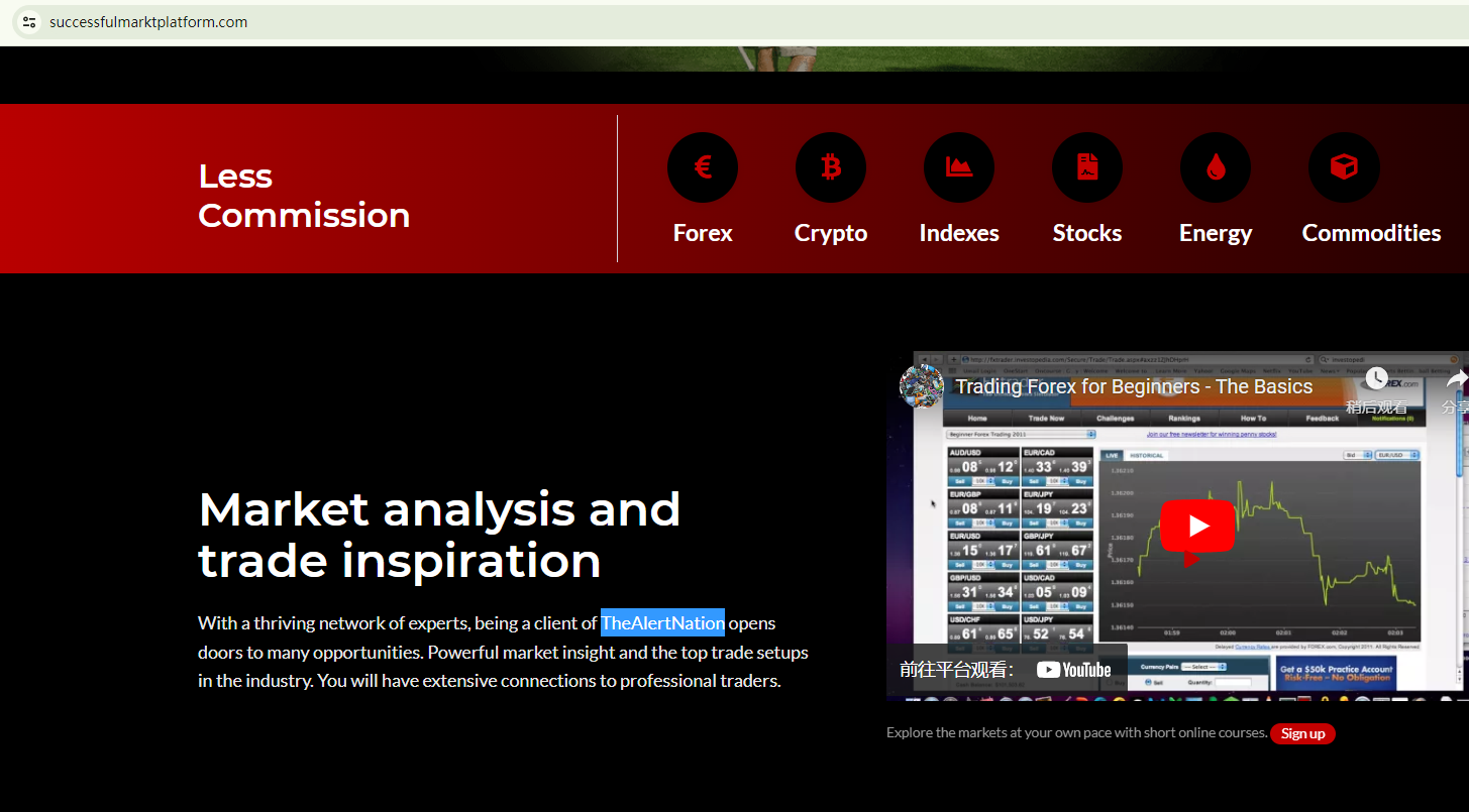 Successfulmarktplatform exhibits common characteristics of fraudulent trading platforms.It employs a website template frequently used by scammers. The poorly designed template, the one-month-old domain name, and the careless content production with low-level mistakes are all red flags. For instance, they didn't even bother to fully replace the forex brand name with their own, leaving "Sure Fx nation Company" and "TheAlertNation" on the website to refer to themselves, resulting in a jumbled self-description.Moreover, it showcases a counterfeit certificate to persuade unsuspecting investors of its US licensure. However, it is not licensed in the US, as it is not a member of the National Futures Association (NFA). Despite listing a UK address, it is not registered with the Financial Conduct Authority (FCA).In addition, the Cyprus Securities and Exchange Commission (CySEC) has added Successfulmarktplatform to its warning list, stating it does not belong to an entity which has been granted an authorization for the provision of investment services and/or the performance of investment activities in Cyprus.In essence, Successfulmarktplatform is not regulated by any governing body. Entrusting this broker with investors' funds is highly risky, as there are no legal protections in place to safeguard the funds.Successfulmarktplatform is unequivocally a scam.