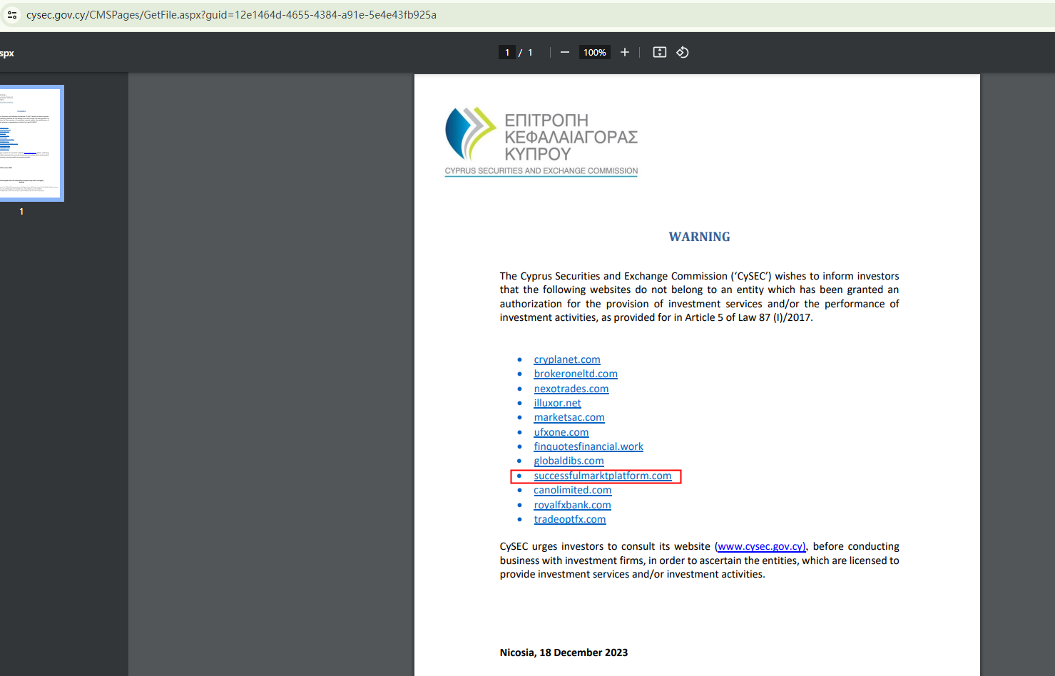 In addition, the Cyprus Securities and Exchange Commission (CySEC) has added Successfulmarktplatform to its warning list, stating it does not belong to an entity which has been granted an authorization for the provision of investment services and/or the performance of investment activities in Cyprus.