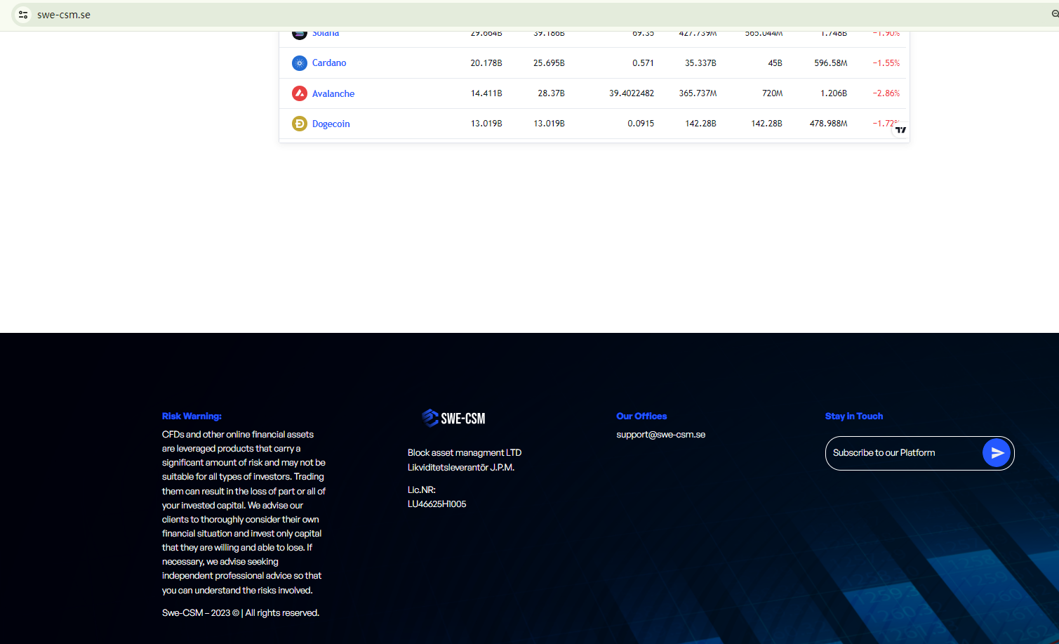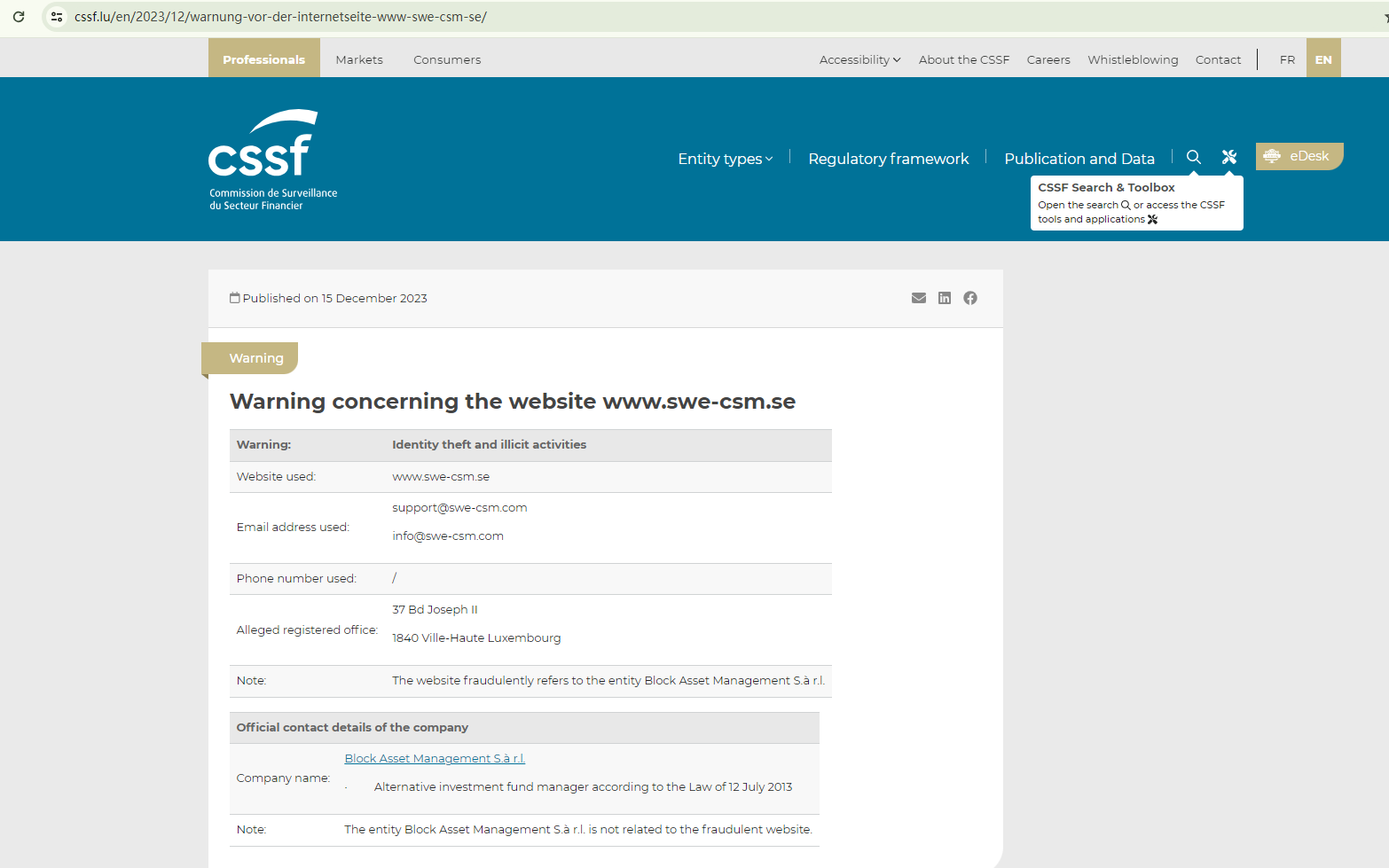 Swe CSM falsely claims to be operated by BLOCK ASSET MANAGEMENT LTD. This has been refuted by Luxembourg's financial regulator, the Commission de Surveillance du Secteur Financier (CSSF). The CSSF warns that Swe CSM is fraudulently associating itself with Block Asset Management S.à r.l., a company that is not connected to this platform. This constitutes identity theft.
