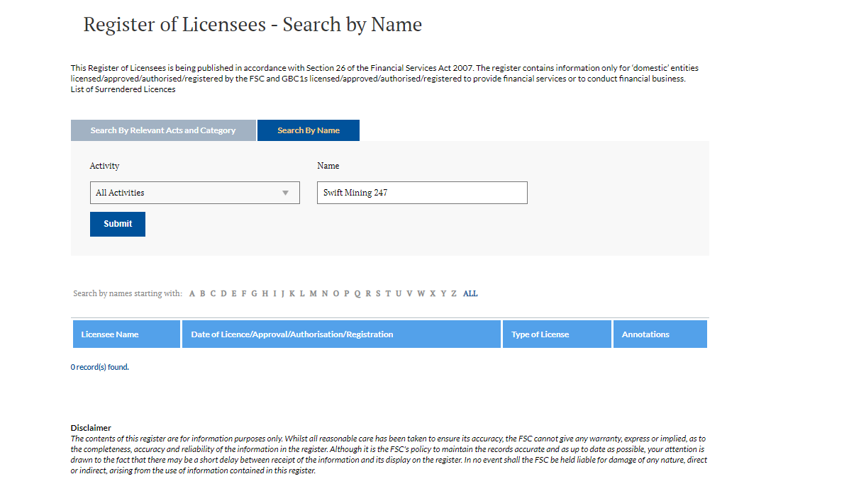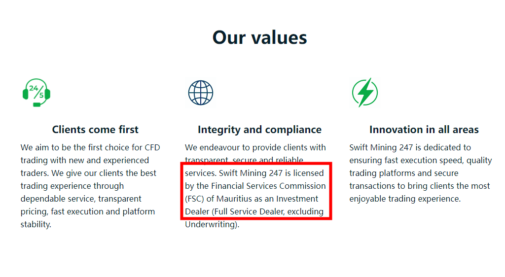 The Swift Mining 247 platform claims to be a regulated broker that provides investment and trading services in financial derivatives such as foreign exchange, stock CFDs, indices, precious metals, cryptocurrencies, and commodities. In addition, it claims to be regulated by the Financial Services Commission, Mauritius(FSC), but there is no any matching information was found in the regulator.