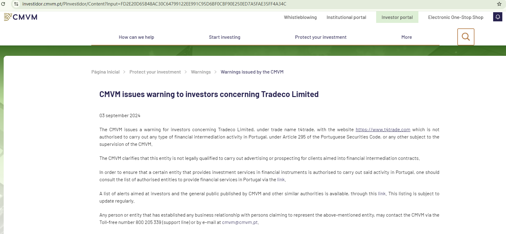 T4Trade claims to be a trade name of Tradeco Limited, a company regulated by the Seychelles Financial Services Authority (Seychelles FSA) with licence number SD029. So we searched Seychelles FSA and found the company. However, the information on the website of the regulatory body, such as the address, did not match the information on T4Trade's website. In other words, T4Trade is not regulated by Seychelles FSA.Moreover, the France Autorité des Marchés Financiers (AMF) issued a warning that T4Trade was not authorized to provide forex services in France.The truth is that T4Trade is not regulated by any regulators. Letting this broker hold or control investors' money is unsafe, and the money can not be protected by any laws. Therefore, it is a scam.