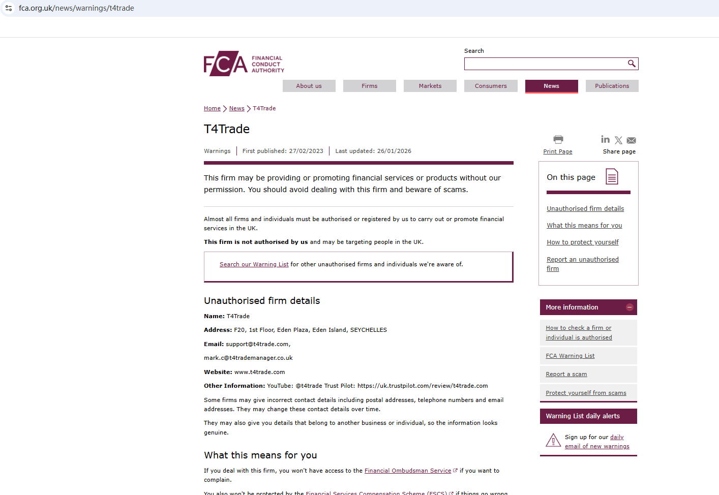 T4Trade claims to be a trade name of Tradeco Limited, a company regulated by the Seychelles Financial Services Authority (Seychelles FSA) with licence number SD029. So we searched Seychelles FSA and found the company. However, the information on the website of the regulatory body, such as the address, did not match the information on T4Trade's website. In other words, T4Trade is not regulated by Seychelles FSA.